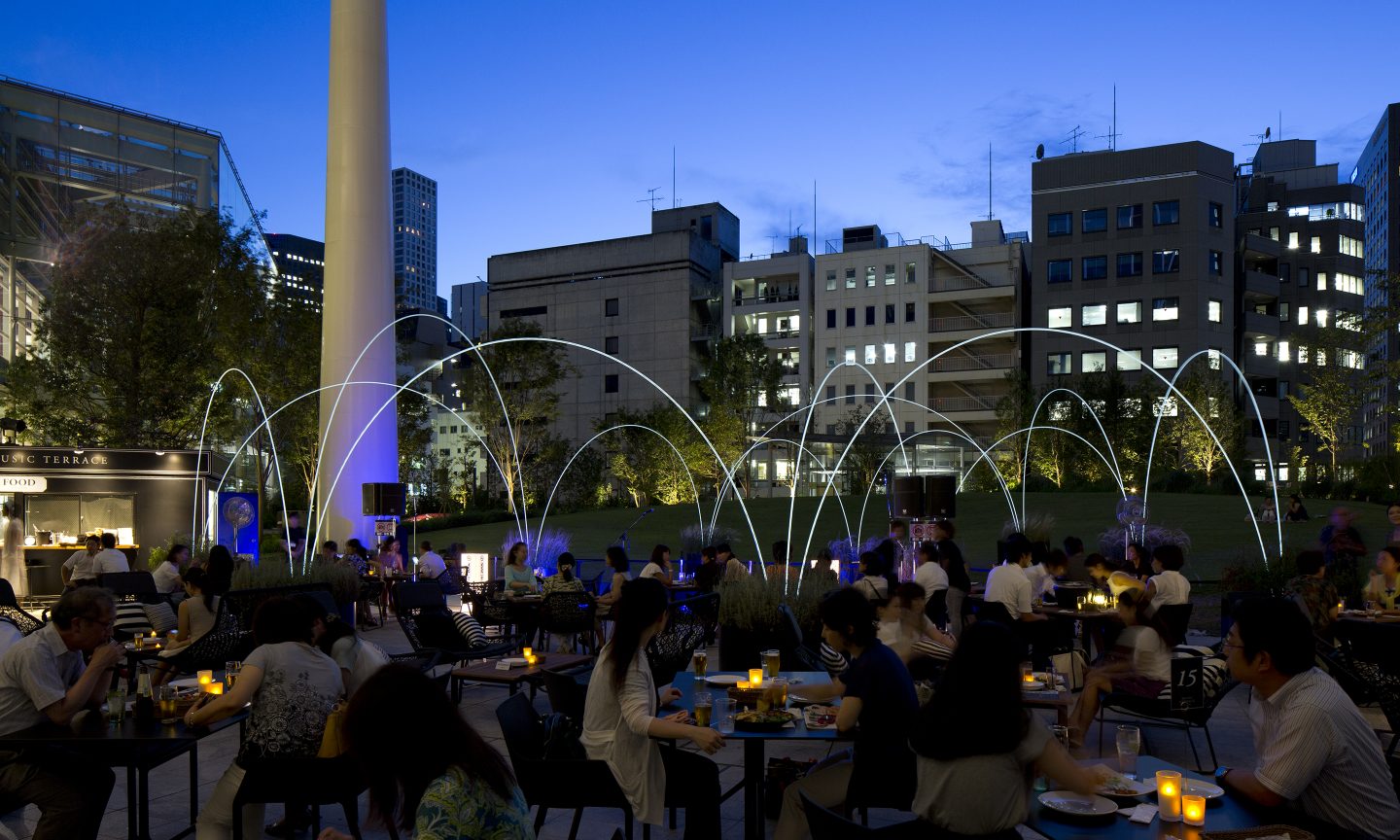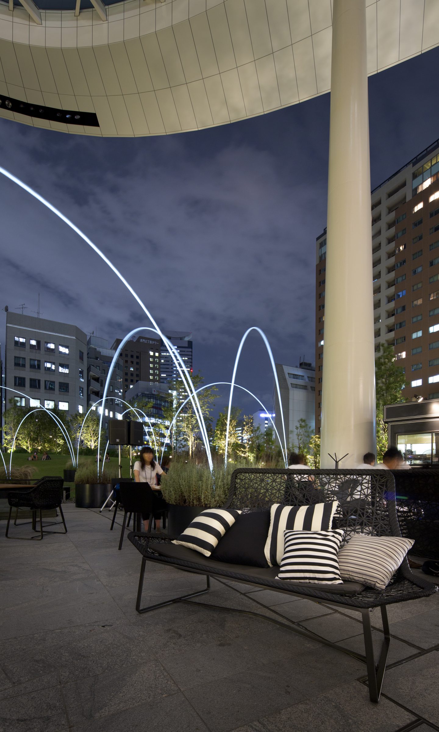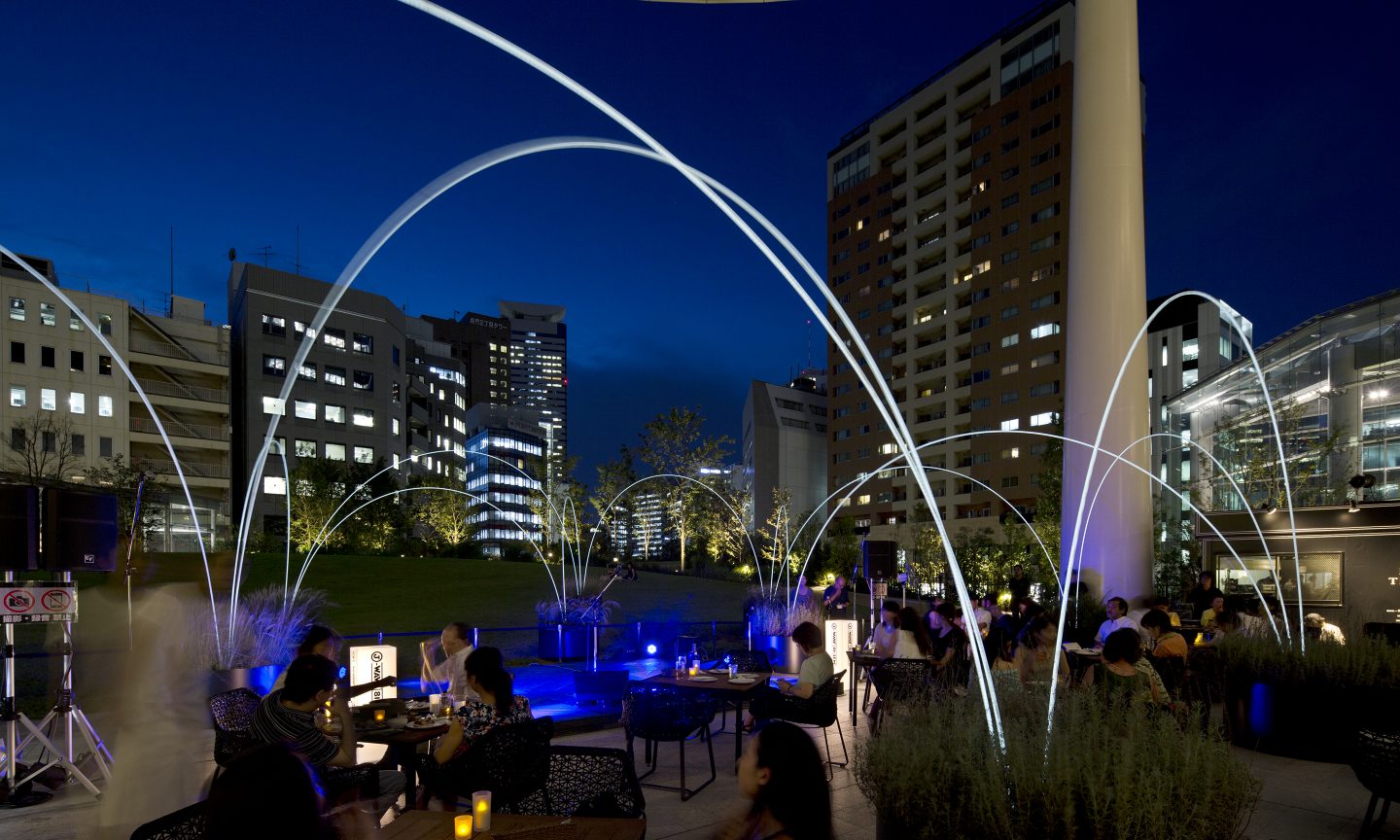 夏の夜のリラックスした時間とより親密な関係性を築くことができるよう風になびくモノを見ることによって「涼やかさ」を感じるという視覚原理を用い人々の想像力を借りて完成する場、涼やかで幻想的な空間を演出しています。