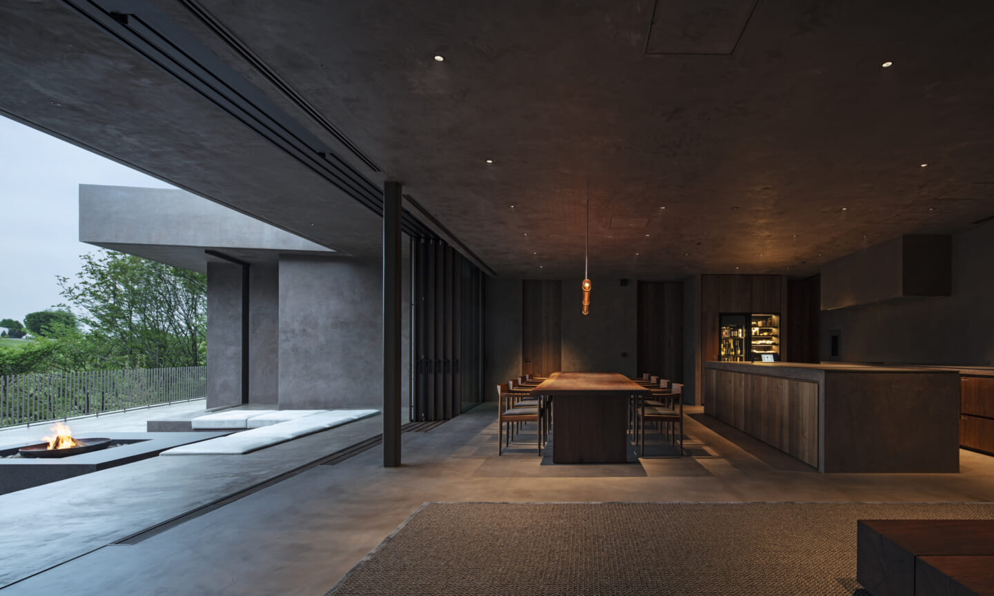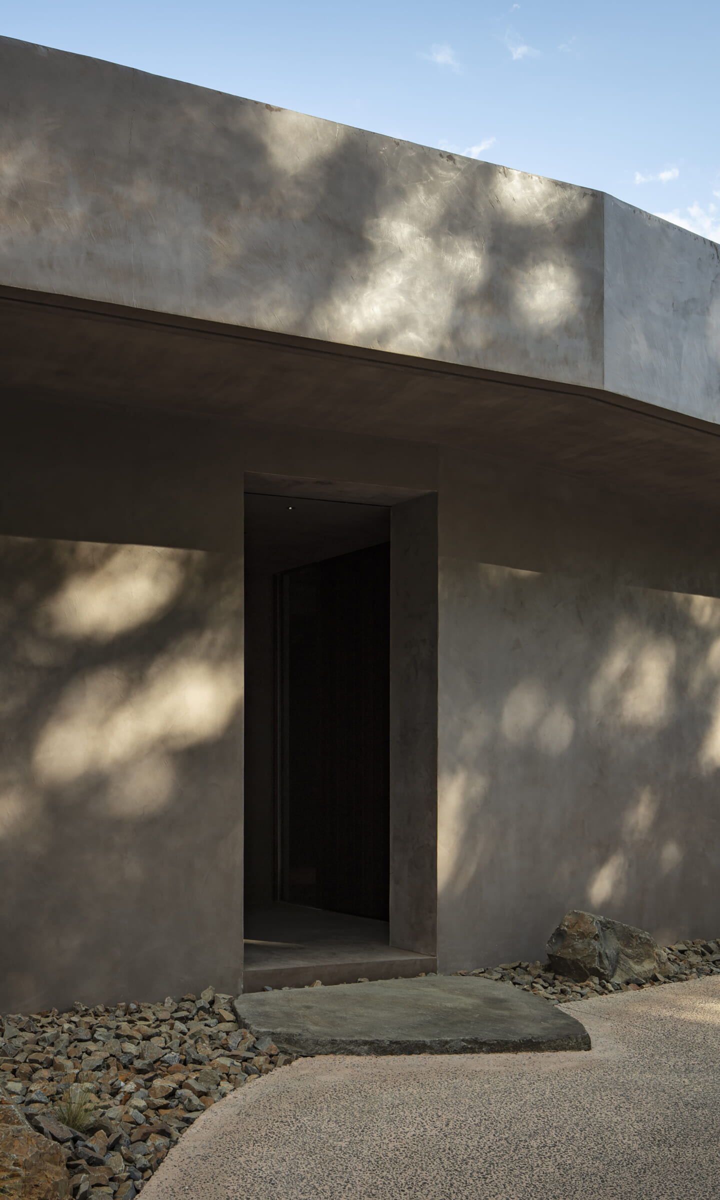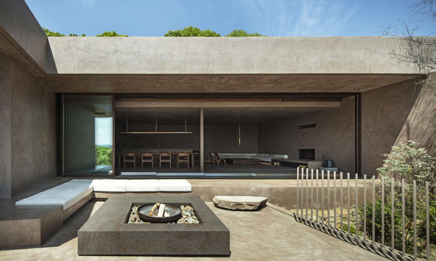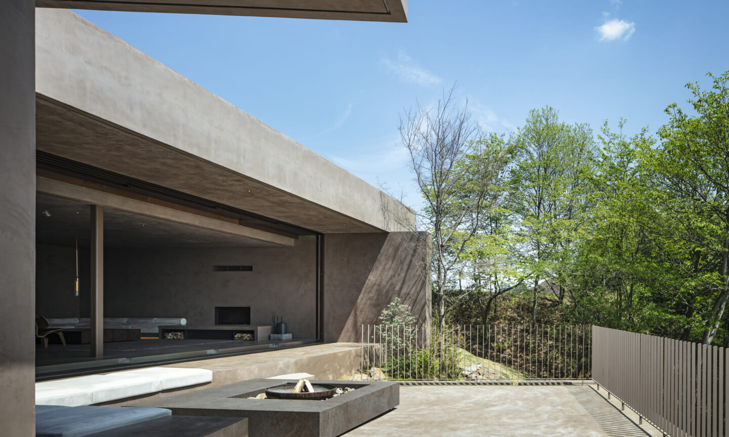 この建築体験において中心的な役割を果たしているのがテラスです。テラスは異なるエリアをつなぐ主な動線であるとともに、暖炉、プール、リラクゼーションデッキなど、アウトドアライフスタイルを促進する様々な機能を備えています。古代の洞窟が時を経て形作られたように、この建築は風景に刻まれた単一素材のモノリスとして佇んでいます。異なる比率やボリュームが多様な眺望と風景との関係性を創出し、色付きコンクリート、ウォールナット材、銅といった素材が自然な雰囲気を醸し出しながら、この「現代の洞窟」を周囲の自然に調和させています。