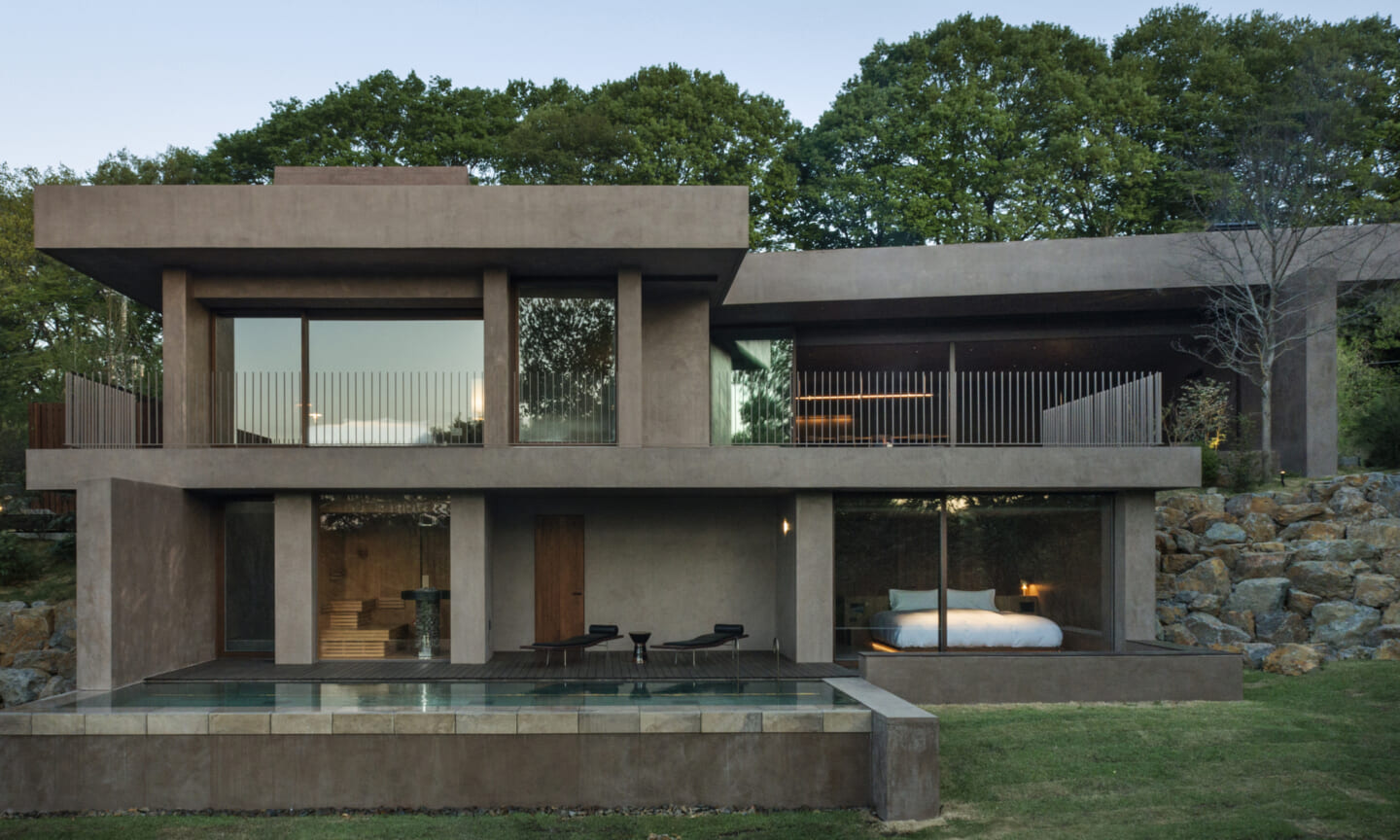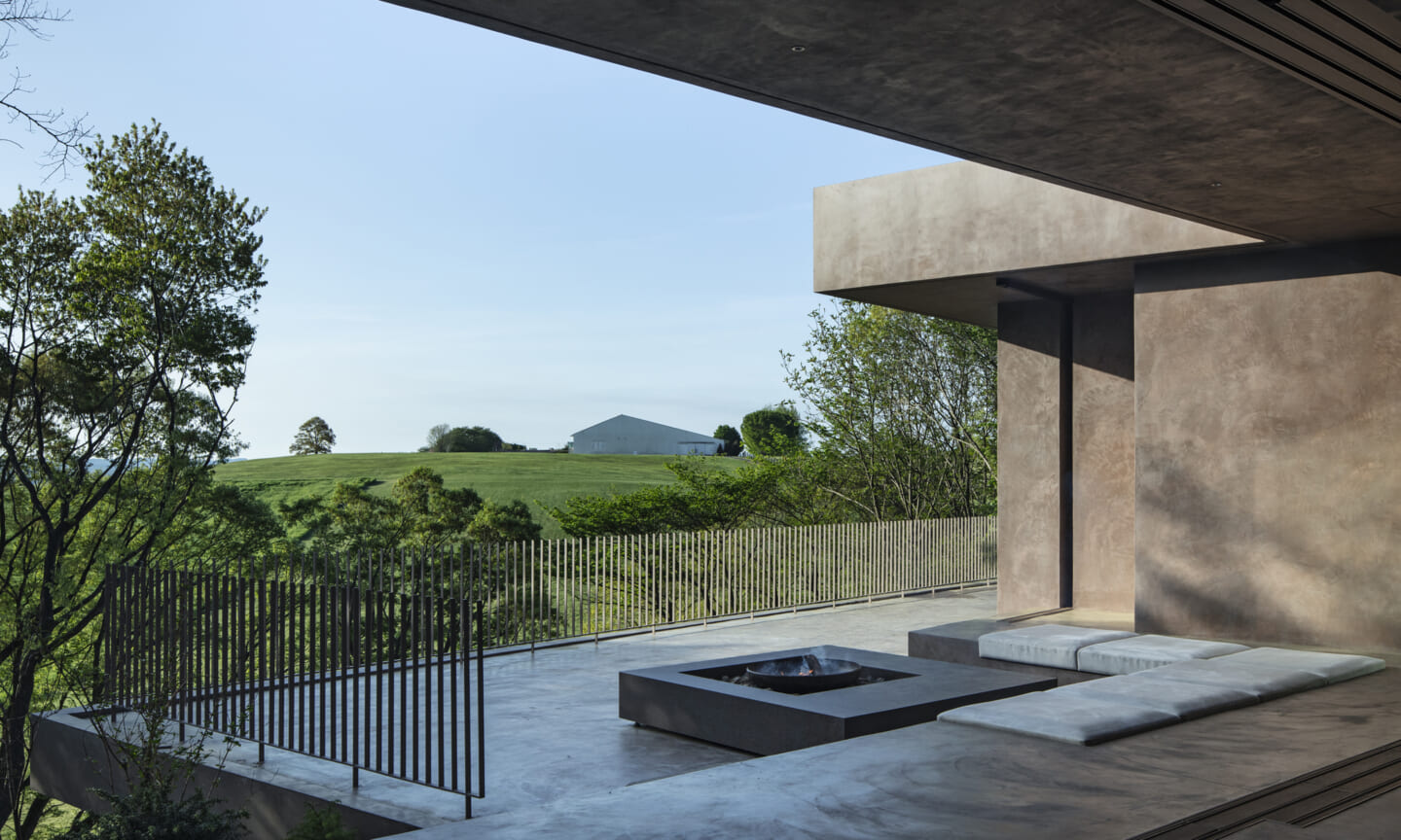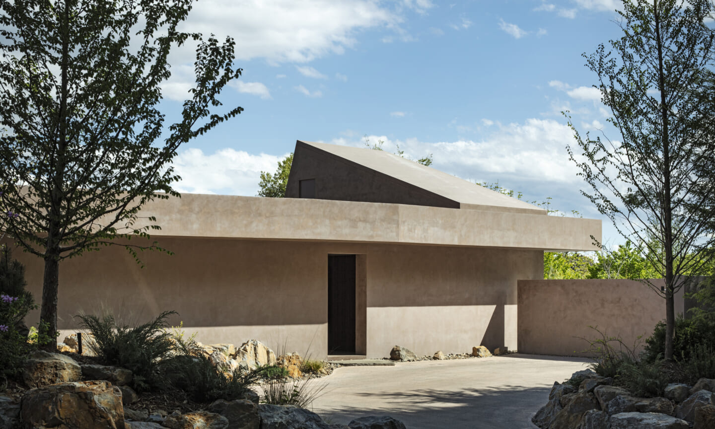 この建築体験において中心的な役割を果たしているのがテラスです。テラスは異なるエリアをつなぐ主な動線であるとともに、暖炉、プール、リラクゼーションデッキなど、アウトドアライフスタイルを促進する様々な機能を備えています。古代の洞窟が時を経て形作られたように、この建築は風景に刻まれた単一素材のモノリスとして佇んでいます。異なる比率やボリュームが多様な眺望と風景との関係性を創出し、色付きコンクリート、ウォールナット材、銅といった素材が自然な雰囲気を醸し出しながら、この「現代の洞窟」を周囲の自然に調和させています。