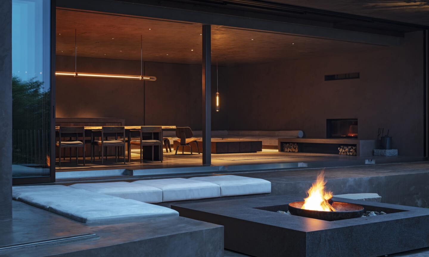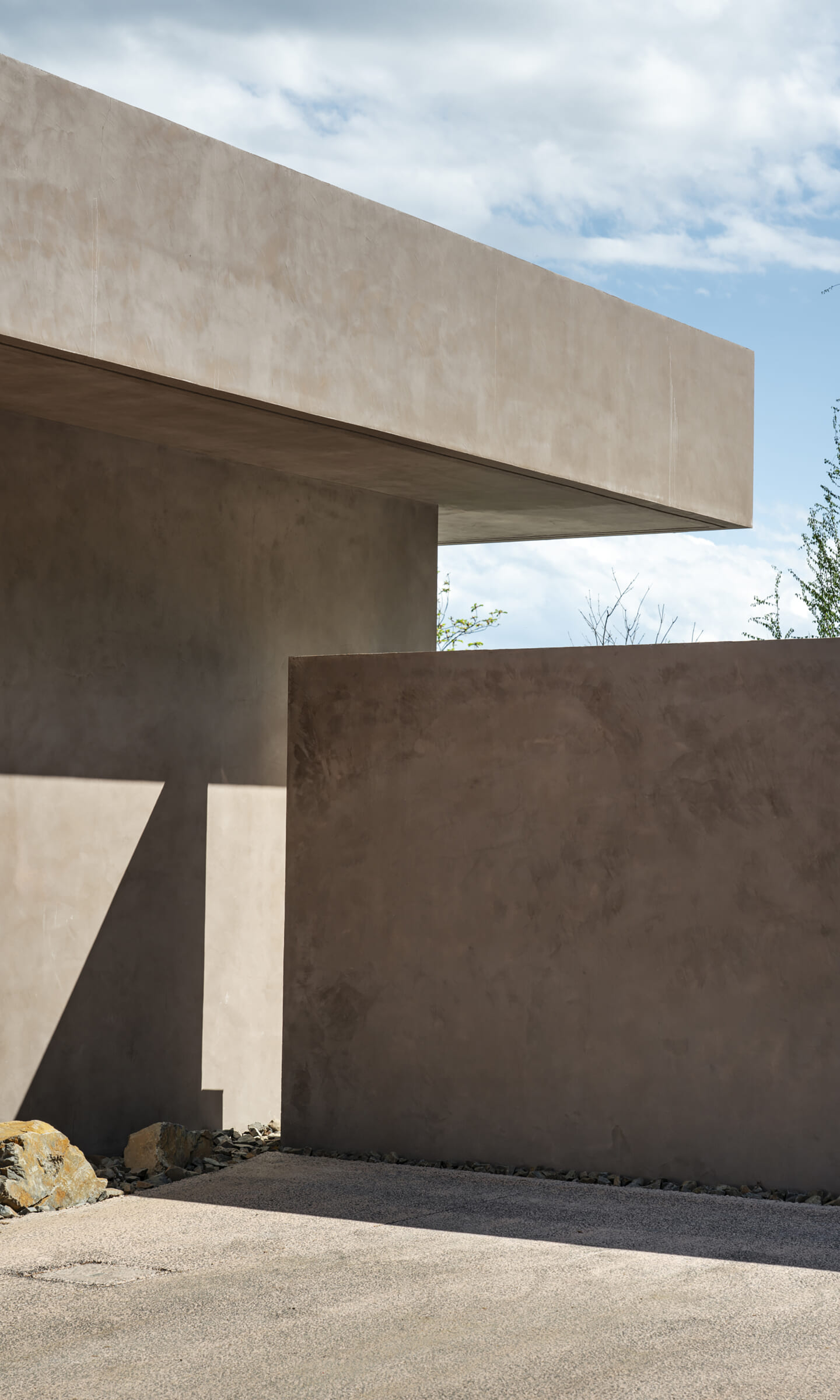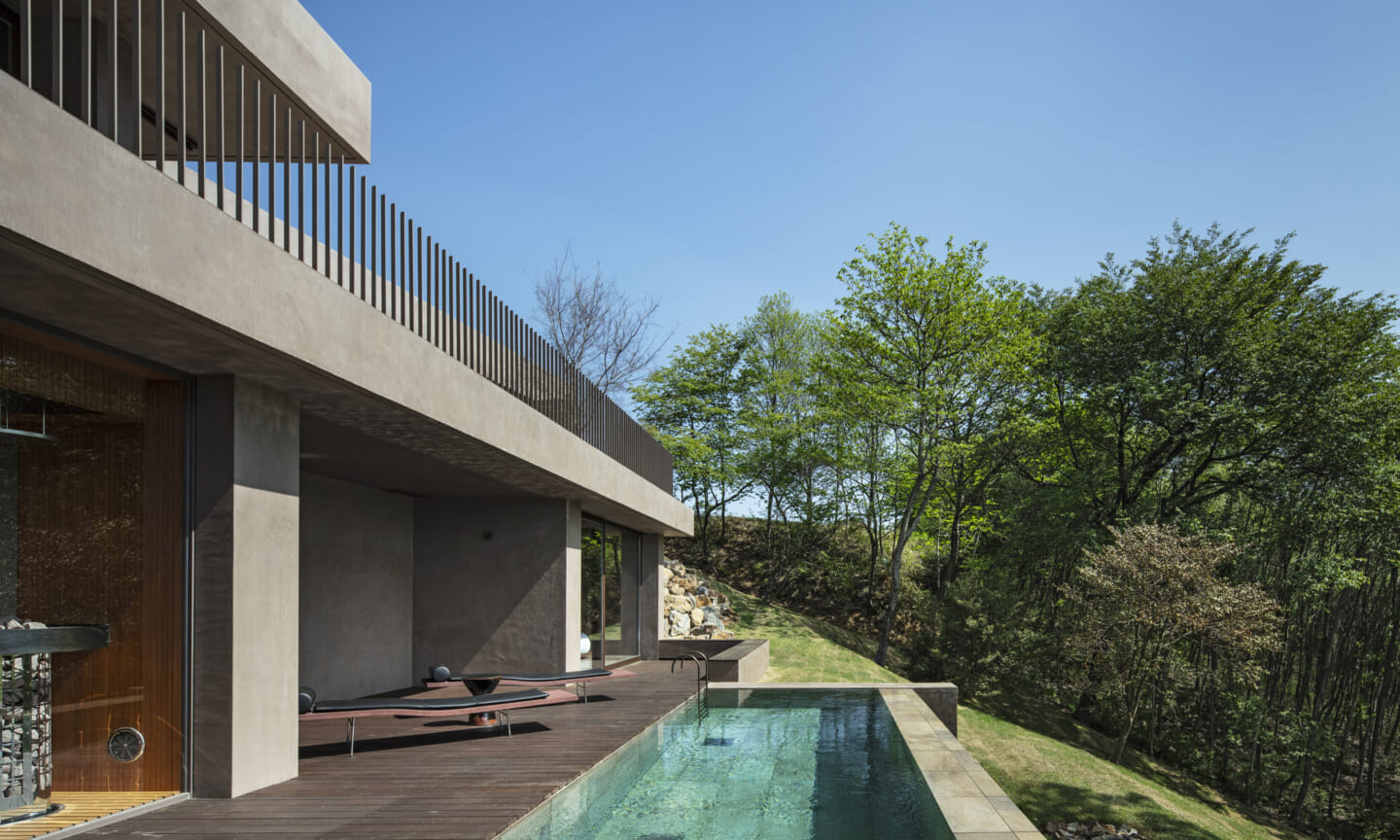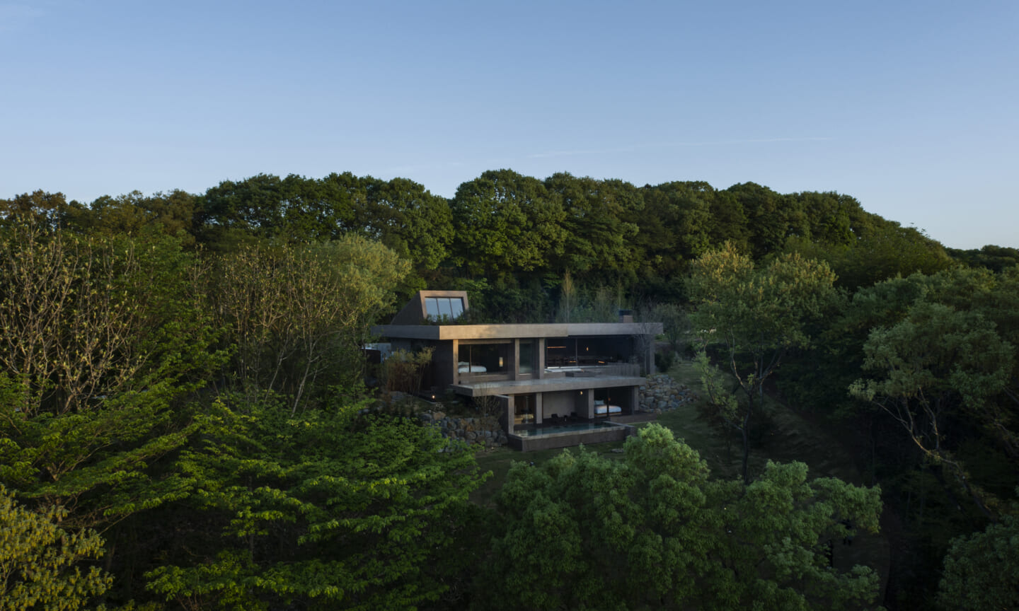 この建築体験において中心的な役割を果たしているのがテラスです。テラスは異なるエリアをつなぐ主な動線であるとともに、暖炉、プール、リラクゼーションデッキなど、アウトドアライフスタイルを促進する様々な機能を備えています。古代の洞窟が時を経て形作られたように、この建築は風景に刻まれた単一素材のモノリスとして佇んでいます。異なる比率やボリュームが多様な眺望と風景との関係性を創出し、色付きコンクリート、ウォールナット材、銅といった素材が自然な雰囲気を醸し出しながら、この「現代の洞窟」を周囲の自然に調和させています。