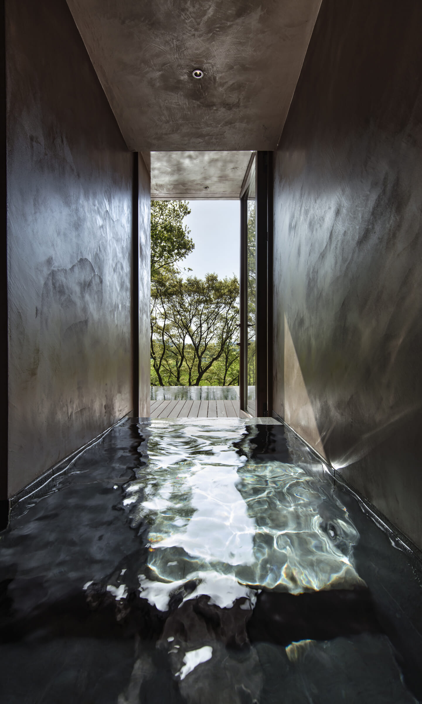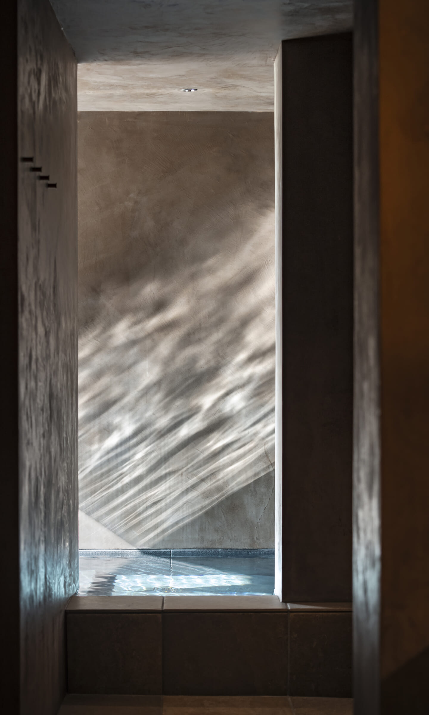 ダイニングエリアから下の1階に降りる階段は、3つ目のベッドルーム、プール、サウナエリアへとつながります。プールへのアクセスは体験的な動線として設計されており、小さな更衣室とパウダールームを通過した後、狭く暗い水路を抜けることで、明るい露天プールエリアとの強いコントラストを生み出します。2階では、広がりのある景観を通じて自然との関係が表現されていますが、1階では植物や木々との近い接触が可能となり、より親密な自然体験が得られるように設計されています。