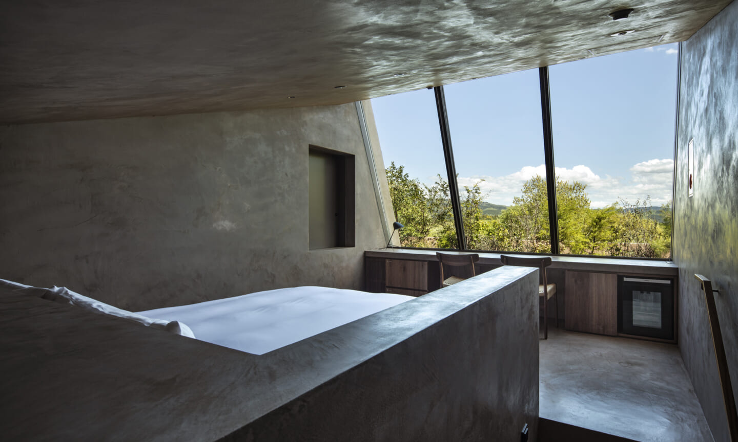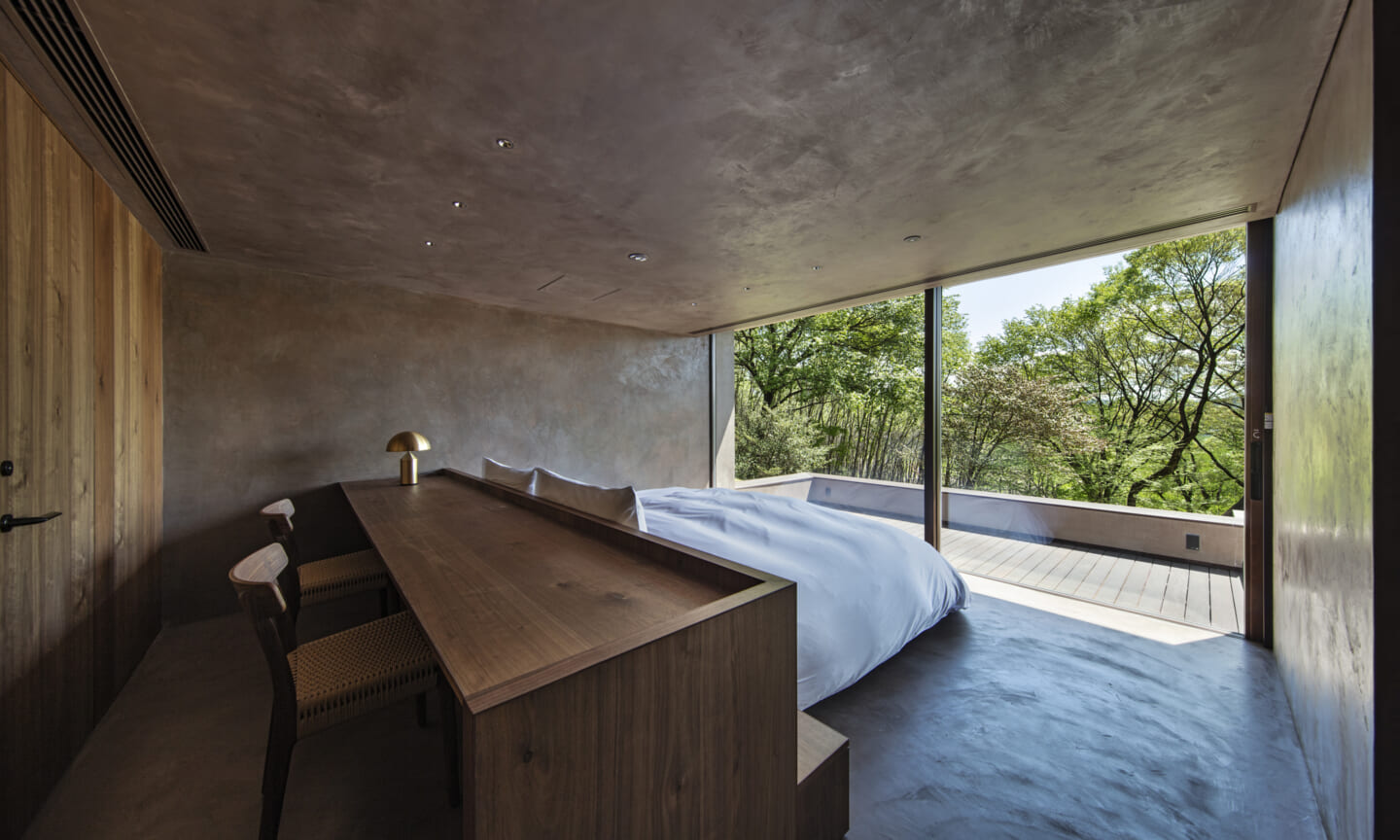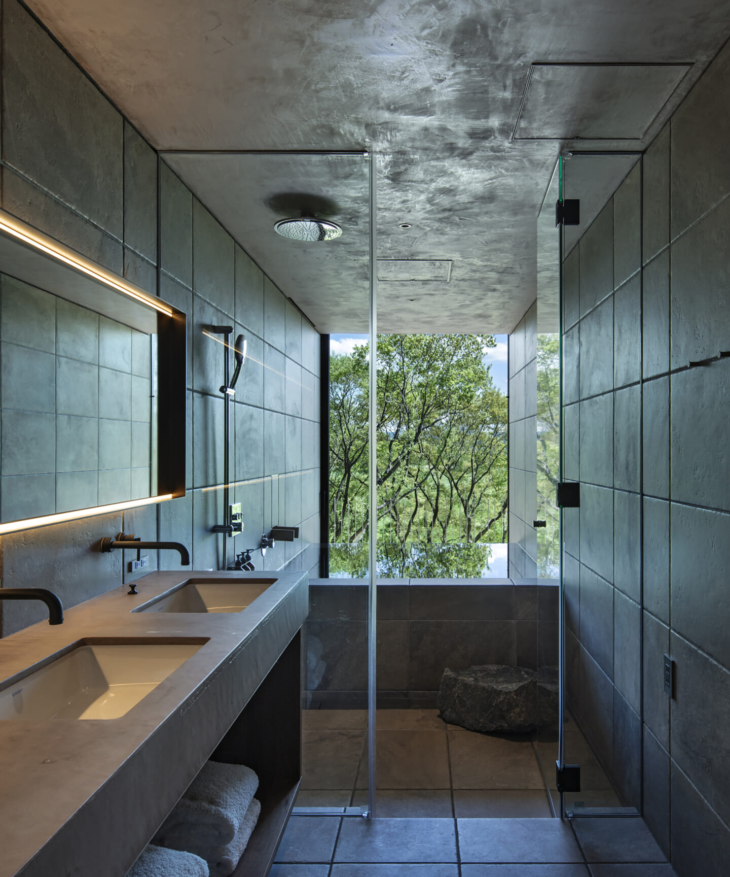 建物全体に統一した単一の素材を採用することで、内装の洞窟的な質感を際立たせるとともに、粗いテクスチャーと鋭い形状の対比が「現代の洞窟」というコンセプトをさらに強調しています。建築は3つの階層で構成されています。中央の中層にはエントランス、大きなキッチン、リビング&ダイニングエリア、マスターベッドルーム、そして全高のスライド窓を備えたバスルームがあり、ゲストは開放的な露天風呂でくつろぐことができます。南東側の狭い階段を上がると、3階にはゲストルームが配置されています。この部屋は小さな小屋のようにデザインされ、大きく傾いた窓から那須の美しい星空や風景を眺めながらベッドでリラックスできるようになっています。