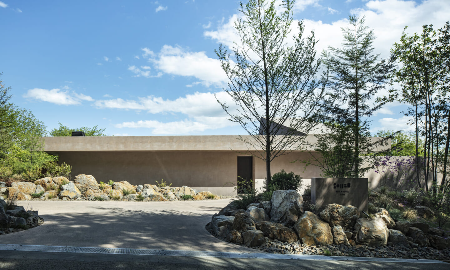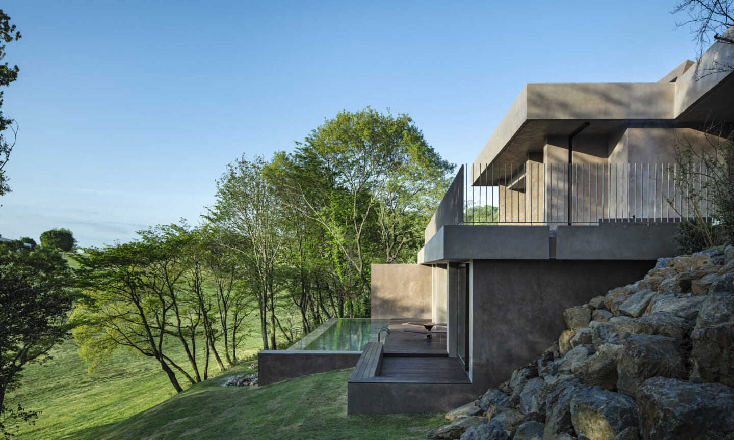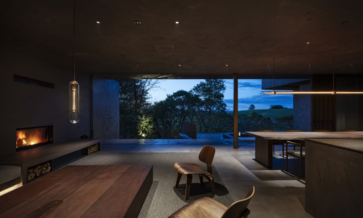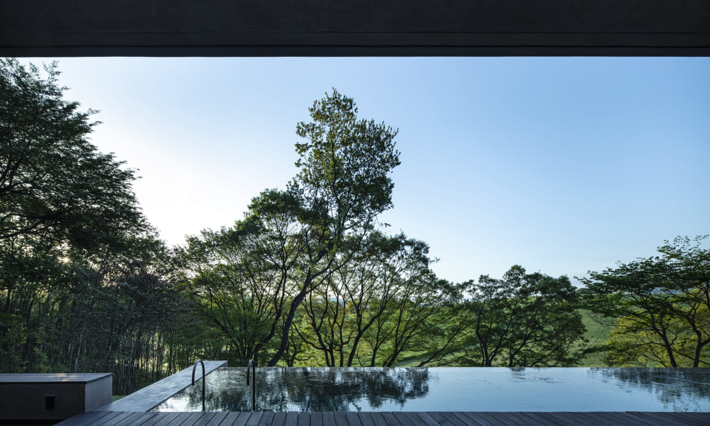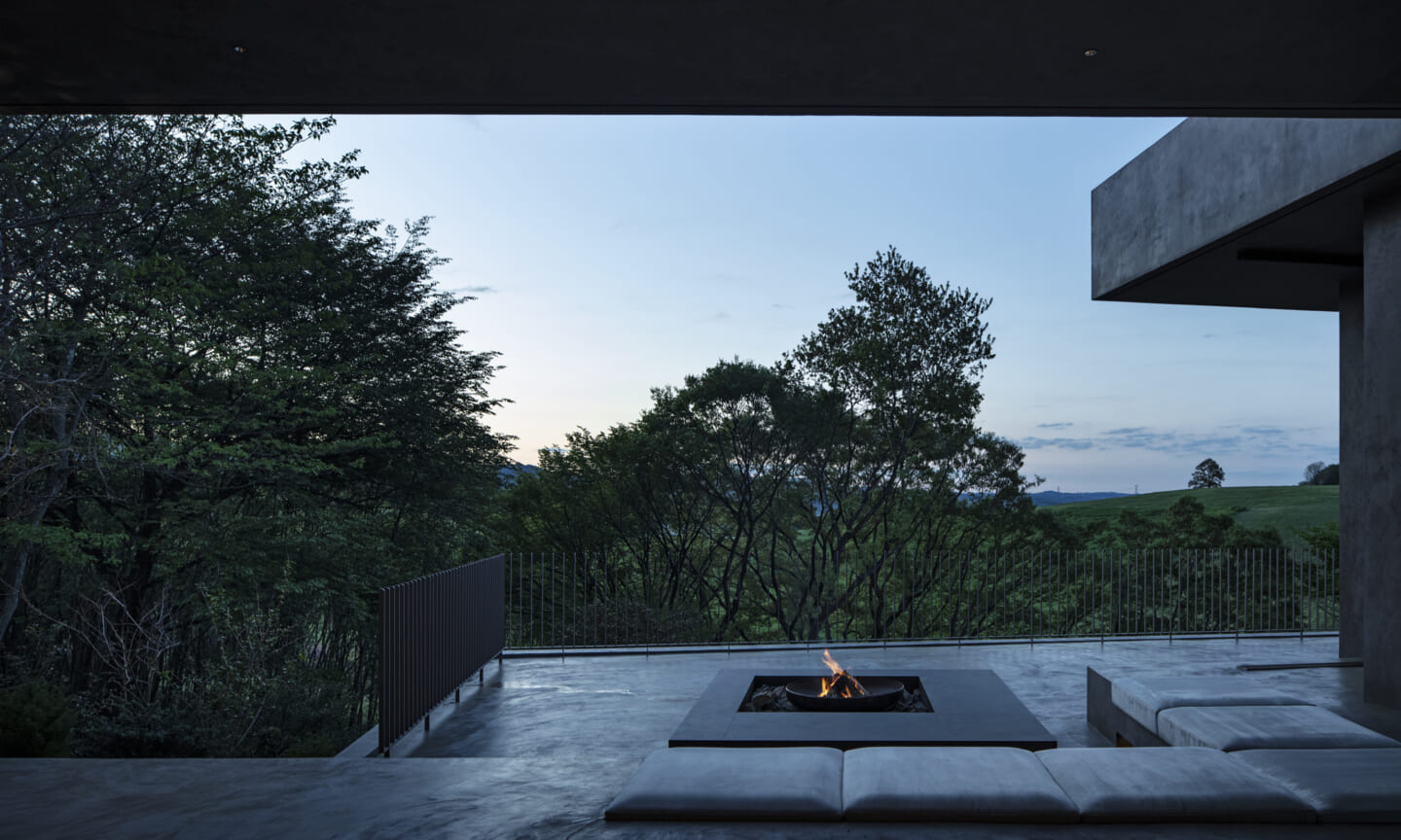 この別荘は、日本の中央部に位置する小さな田舎町、那須の郊外に建つ建築であり、別荘としてもホテルとしても利用されることを目的としています。「Not A Hotel」というネットワークに属しており、日本各地の美しい自然に囲まれたロケーションで、ホテルと別荘の要素を融合させた新しい体験を提供するプロジェクトです。敷地は小さな農場や牧草地、乗馬道が点在する広大な風景に面した丘の上にあります。建築はこの自然な地形に調和するよう計画されており、丘を降りるように段階的に設置された一連のテラスが、静かに自然と融合しています。主な建築ボリュームは「現代の洞窟」として構想され、美しい風景を眺めるためのシェルターの役割を果たしています。天井高や幅の比率を変えることで、それぞれの部屋が異なる形で自然を切り取り、時には親密で守られているように感じさせ、また時には広大で圧倒されるような景観を提供します。