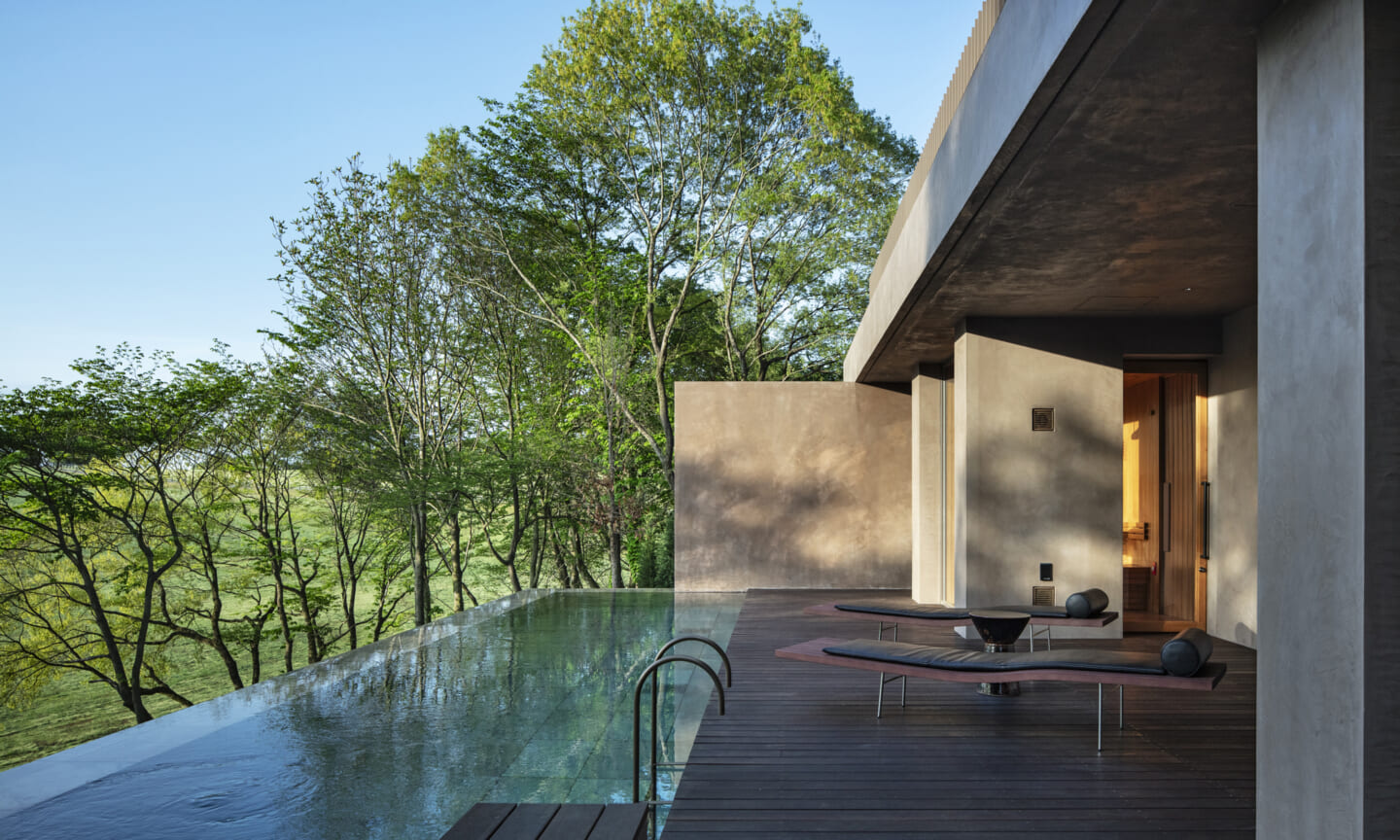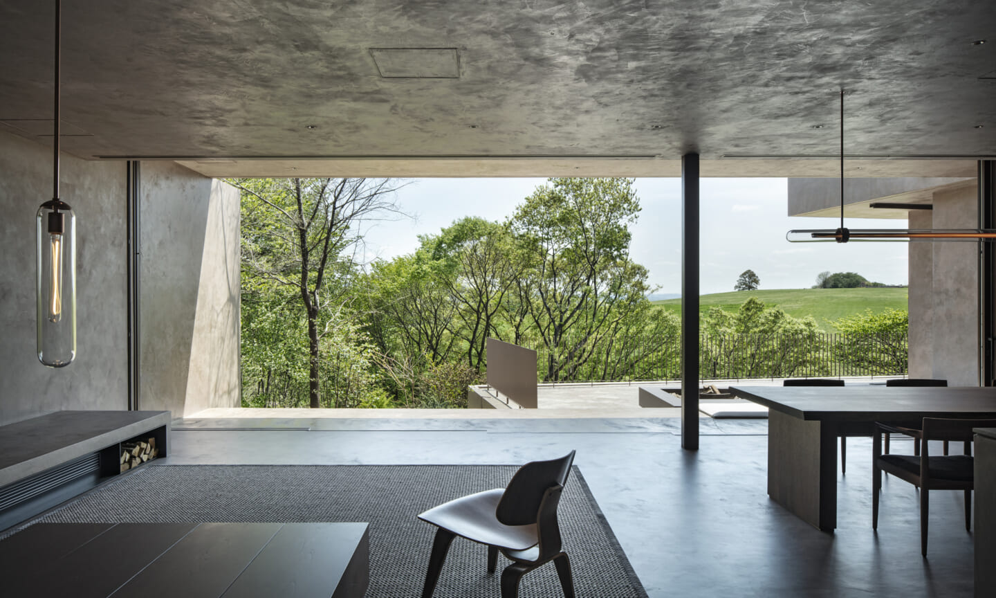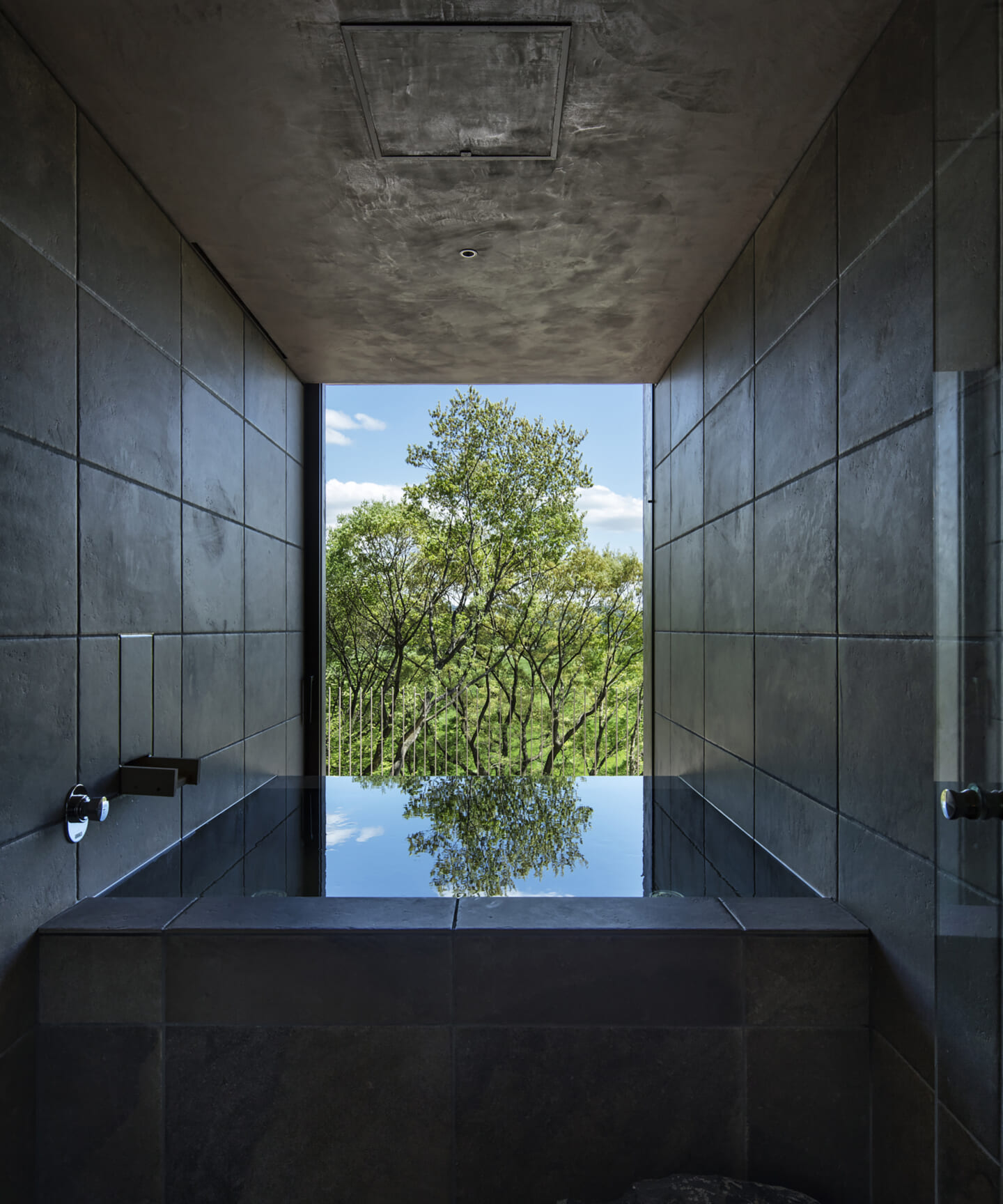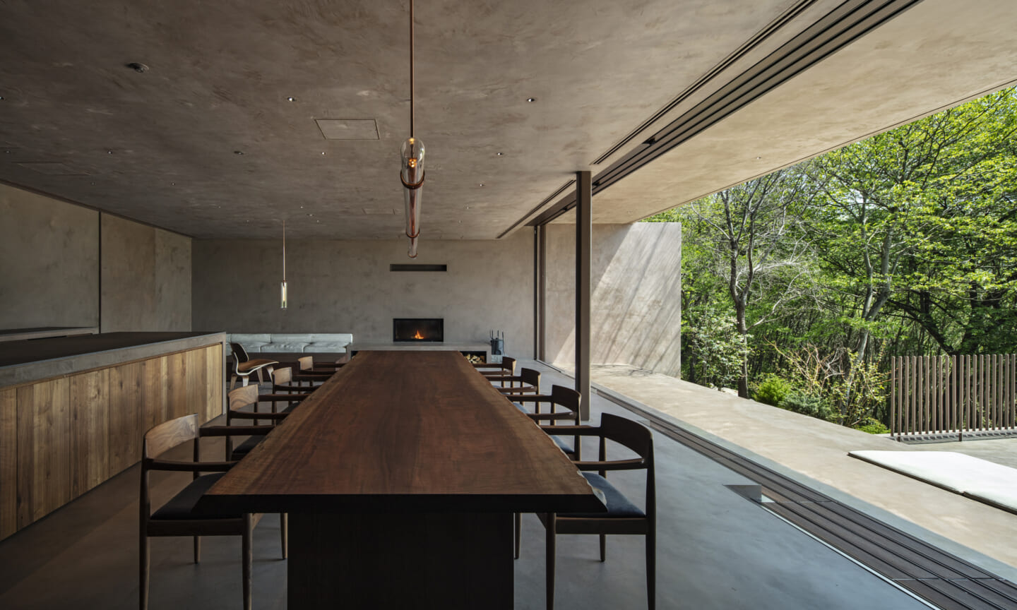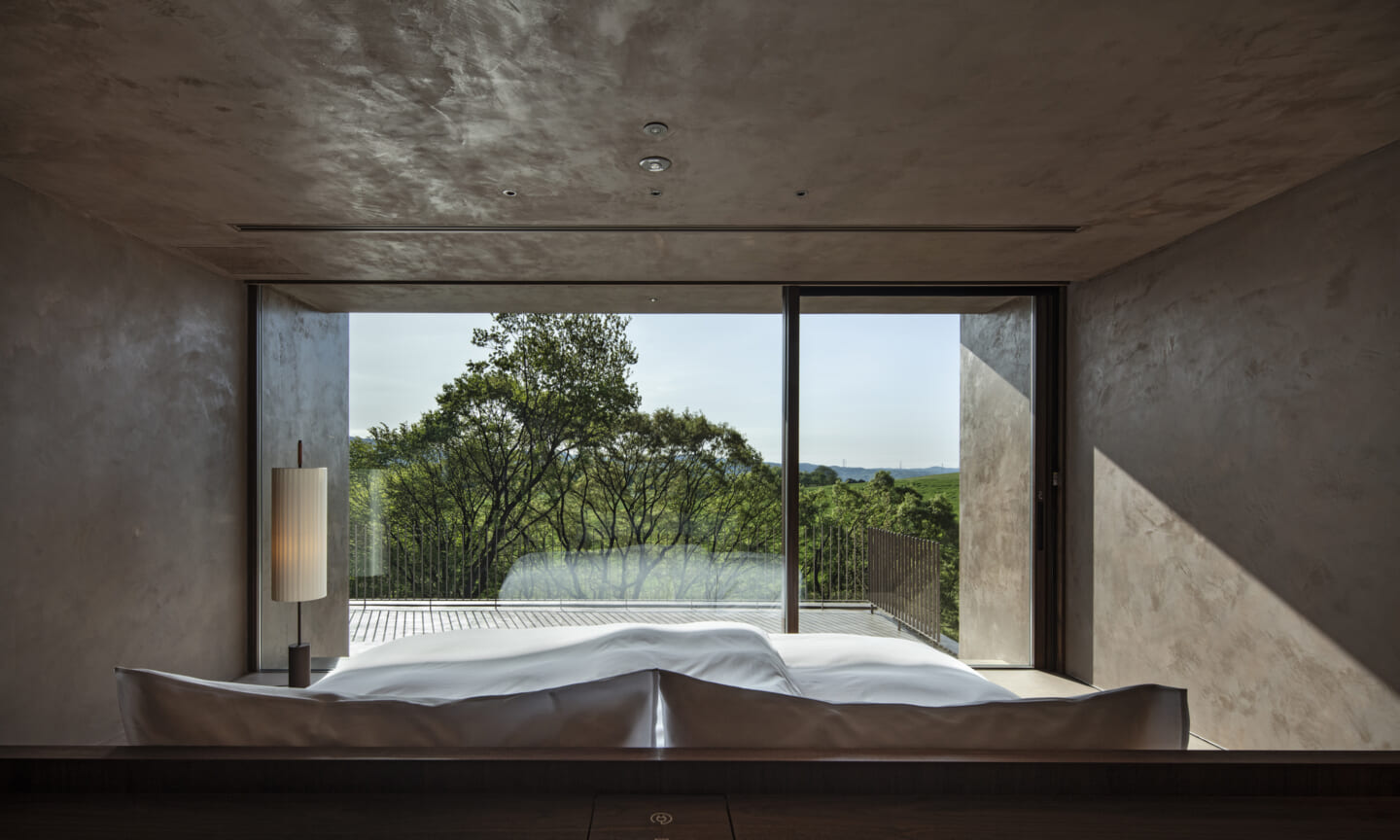 この別荘は、日本の中央部に位置する小さな田舎町、那須の郊外に建つ建築であり、別荘としてもホテルとしても利用されることを目的としています。「Not A Hotel」というネットワークに属しており、日本各地の美しい自然に囲まれたロケーションで、ホテルと別荘の要素を融合させた新しい体験を提供するプロジェクトです。敷地は小さな農場や牧草地、乗馬道が点在する広大な風景に面した丘の上にあります。建築はこの自然な地形に調和するよう計画されており、丘を降りるように段階的に設置された一連のテラスが、静かに自然と融合しています。主な建築ボリュームは「現代の洞窟」として構想され、美しい風景を眺めるためのシェルターの役割を果たしています。天井高や幅の比率を変えることで、それぞれの部屋が異なる形で自然を切り取り、時には親密で守られているように感じさせ、また時には広大で圧倒されるような景観を提供します。