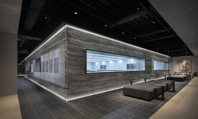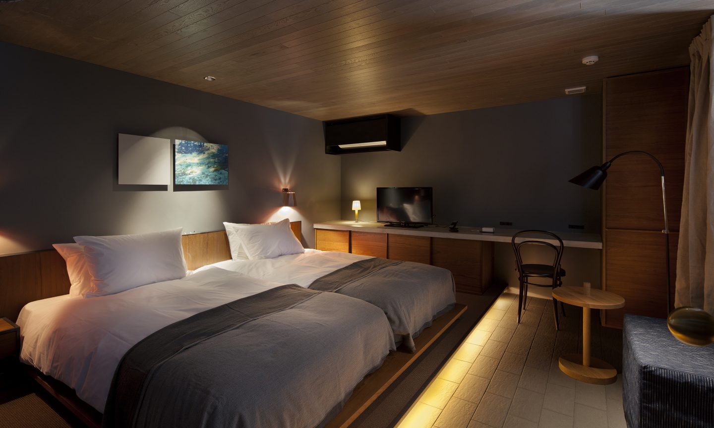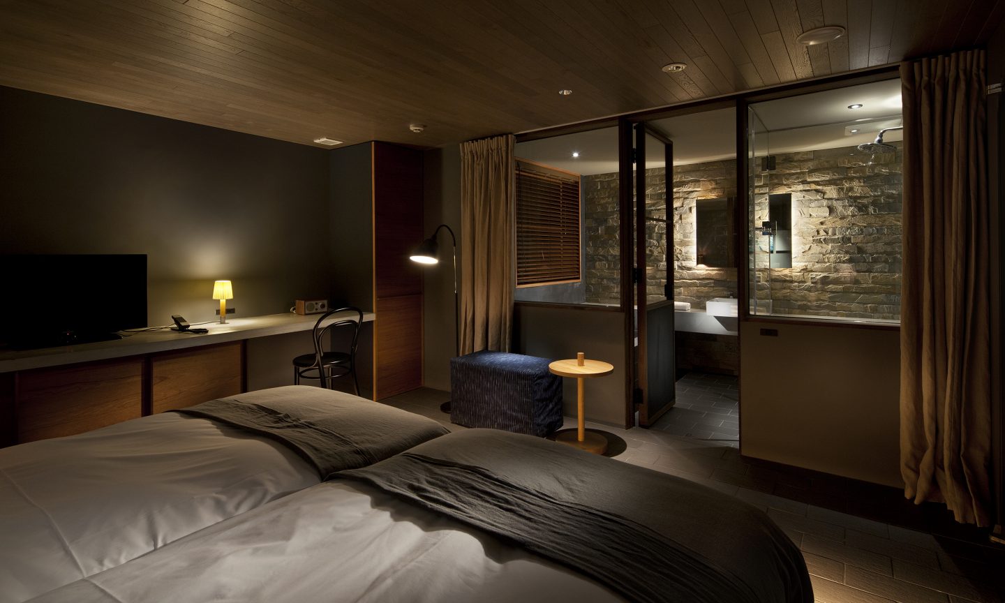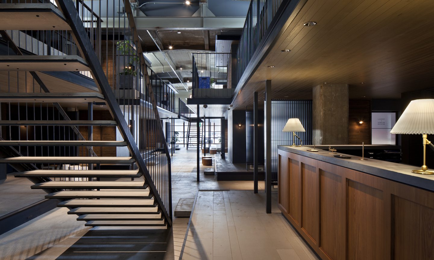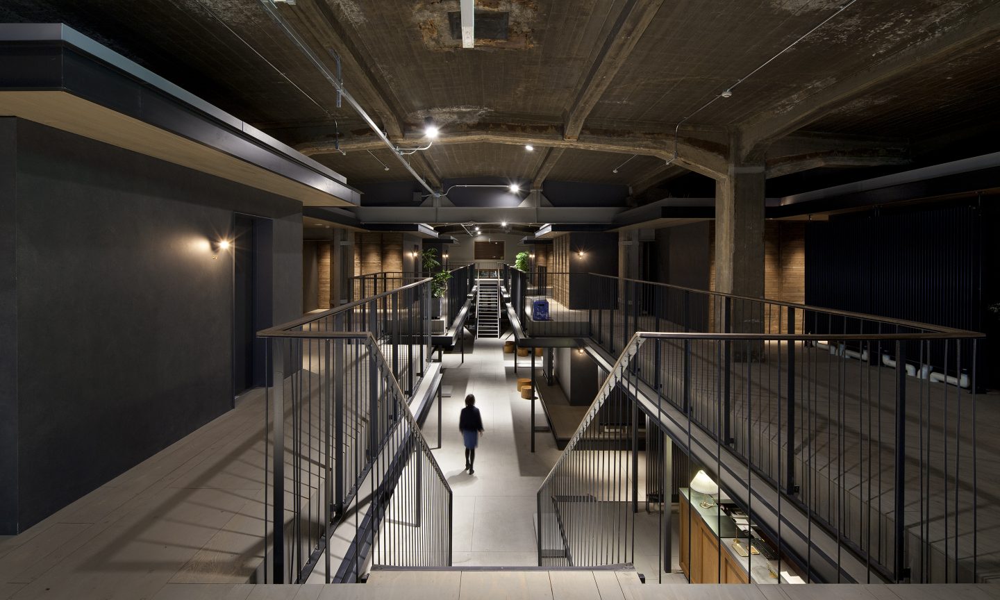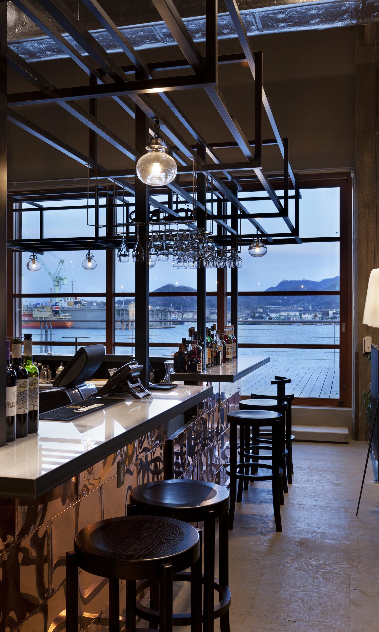 マテリアルには古民家や造船の街にちなんだ、木材、モルタル、スチールを採用し、魚灯を連想させるような照明のアクセントなど小さな要素を緻密に設計し、この街らしさを体験できる空間をつくり出した。