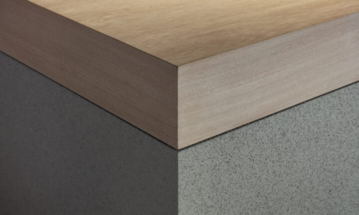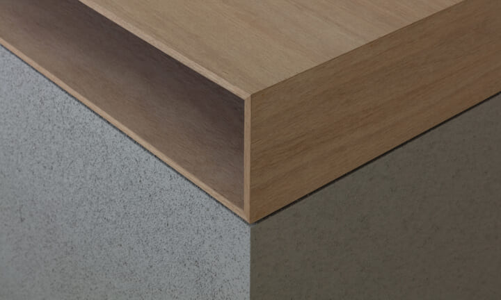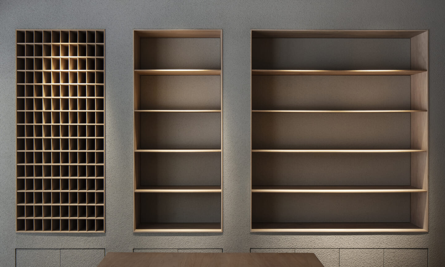 棚板や天板にはラワン合板を用い、地の色味を揃えつつ、わずかに白く染色した。板厚や目地、納まりを丁寧に詰めることで、カジュアルな素材に手仕事の繊細さを宿し、洗練された製品と共鳴する佇まいとしている。