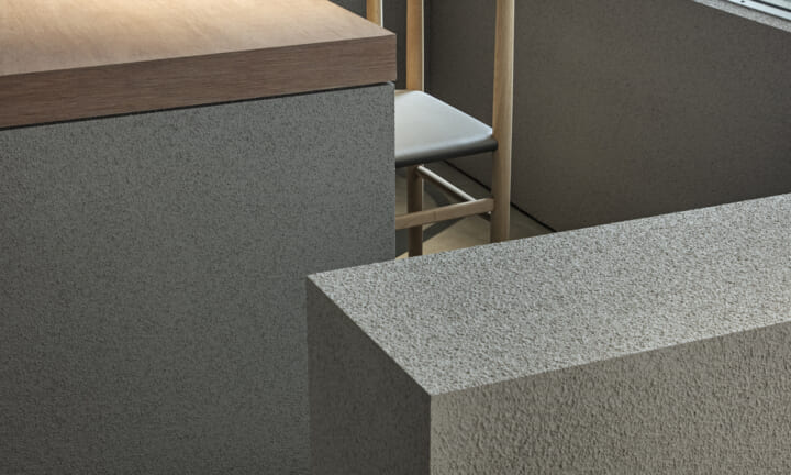 既存店舗には、レンガ腰壁、コンクリートブロック壁、蛍光灯など、時間の中で折り重なってきた痕跡が残っていた。それらを一新するのではなく、温かみを帯びたグレーのリシンで全体をやわらかく覆い、空間をひとつの「地」として整えている。既存の輪郭は背景へ溶け込みながらも、この場所の個性として静かに残る。