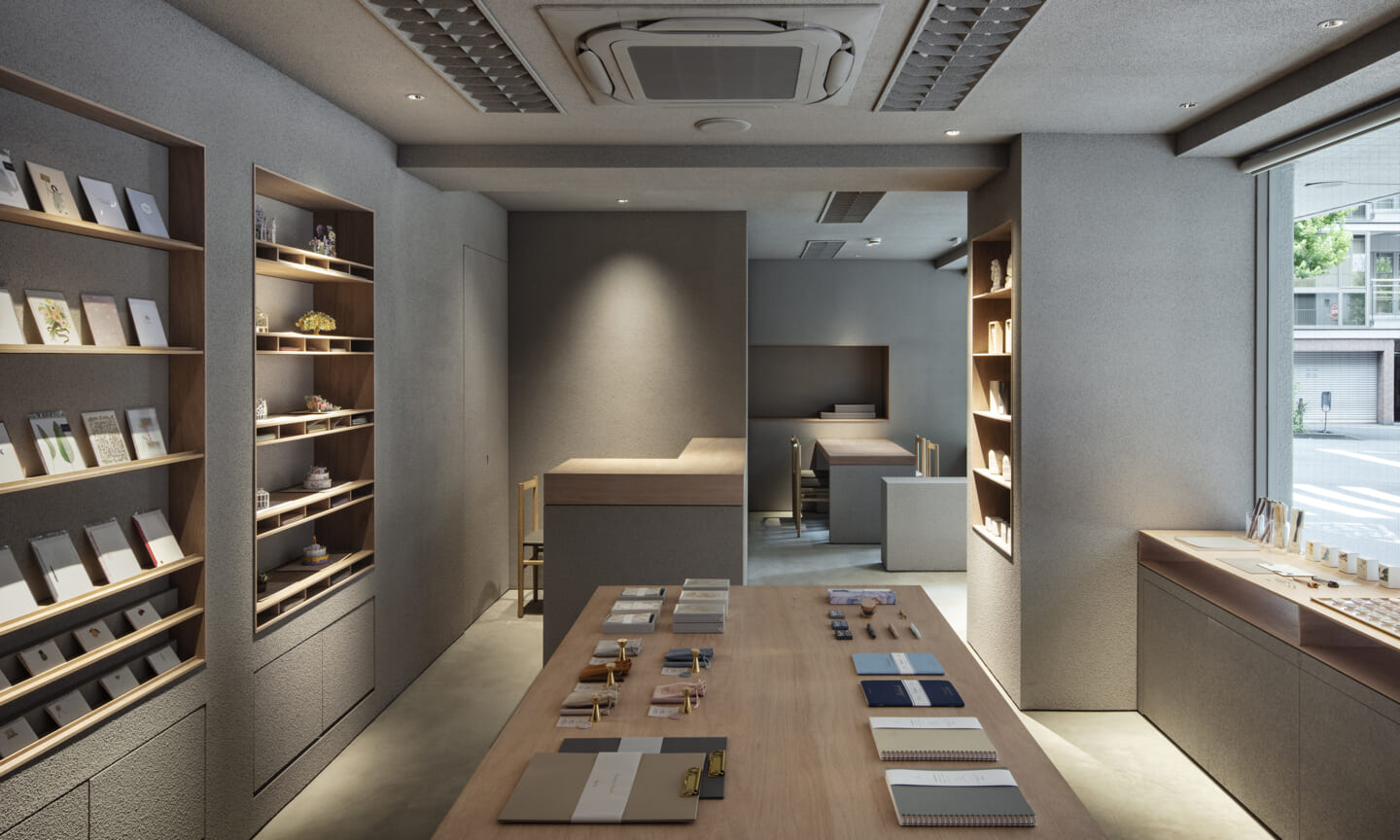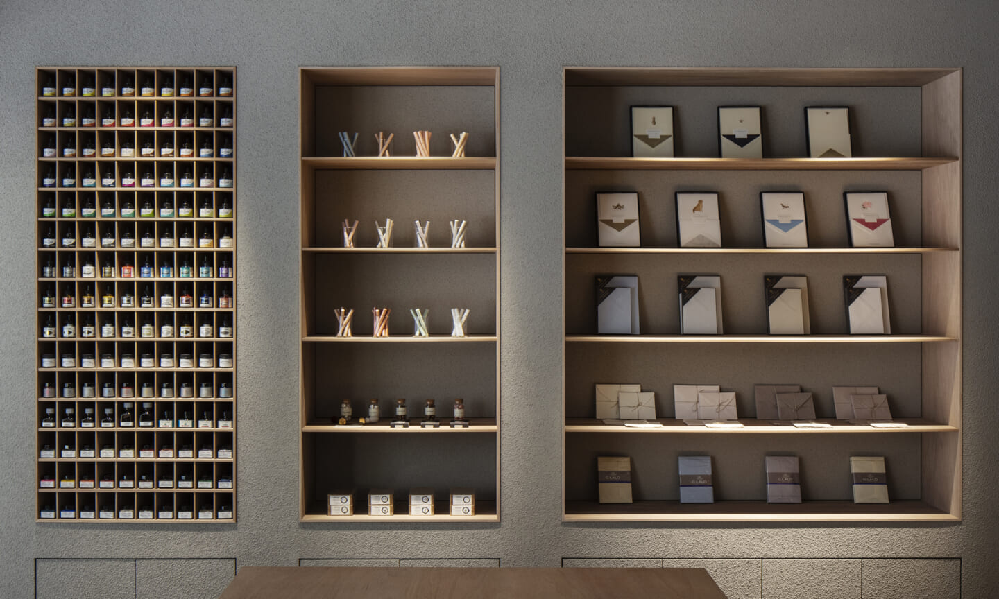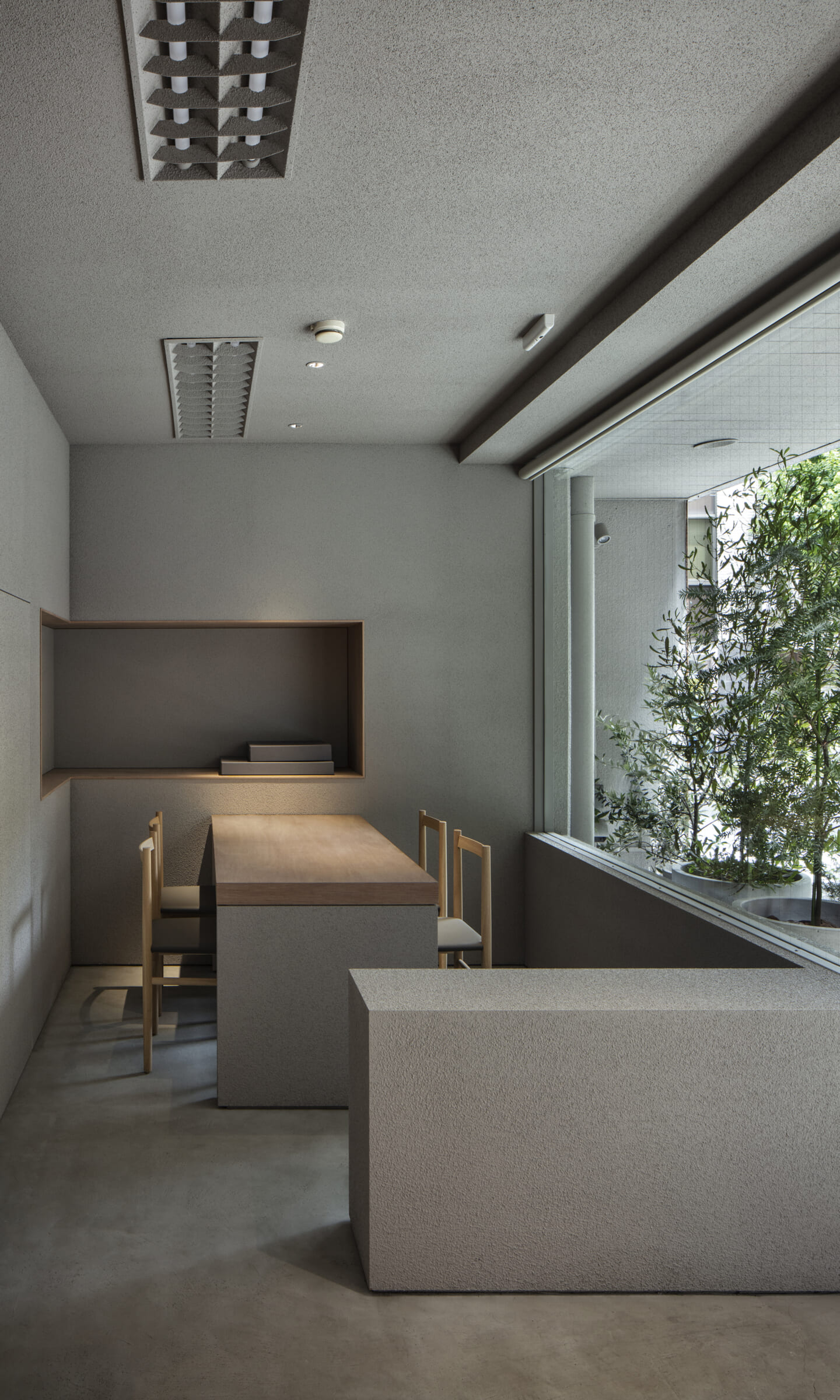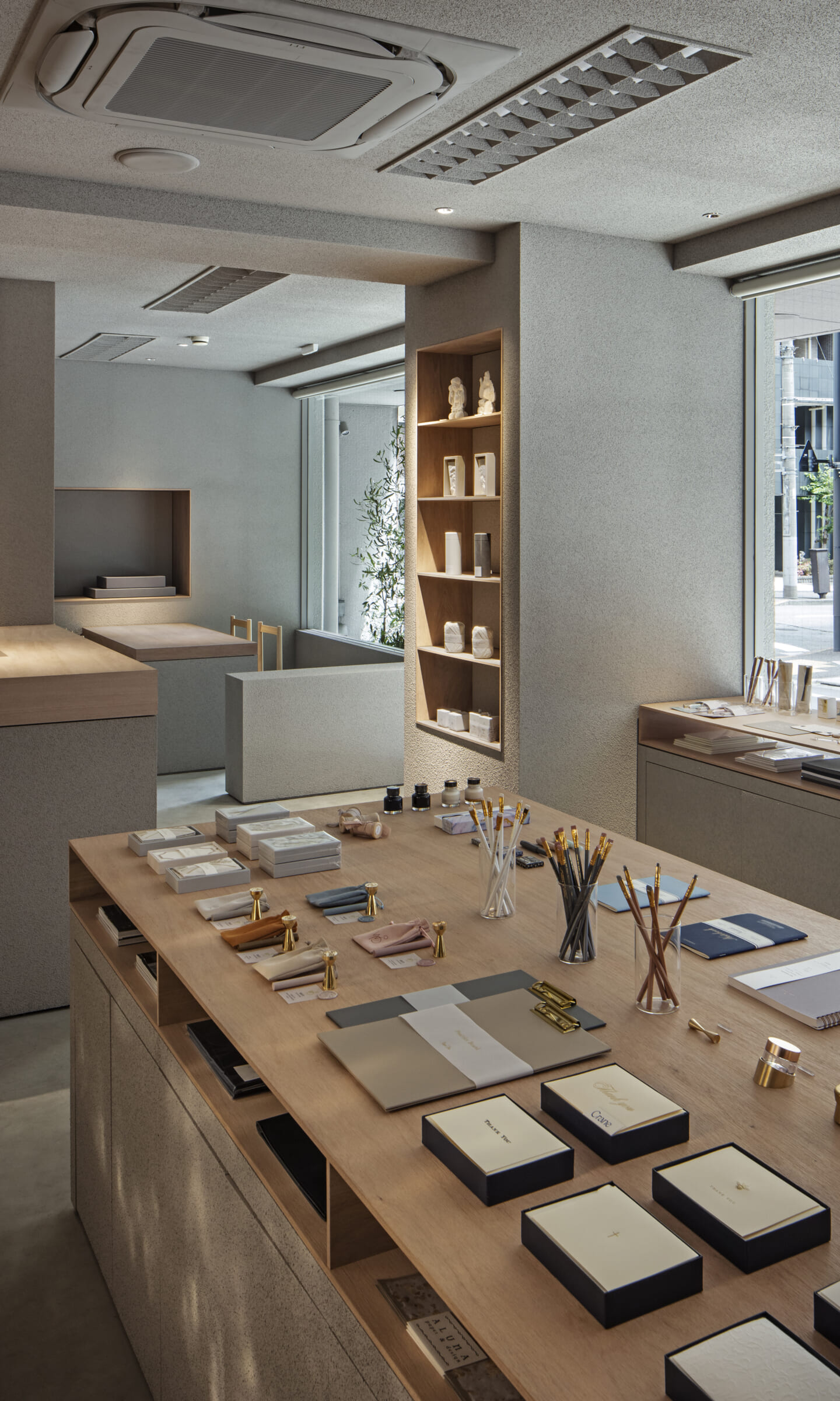 一方、本計画はカリグラフィー用品や紙製品、文具などを扱う店舗である。ペンの書き心地や紙の質感といったわずかな差異に向き合うためには、都市の中で閉じかけた感覚を、ニュートラルな状態へ戻す環境が必要だと考えた。加えて、和洋いずれの製品も受け止める背景としての空間が求められた。