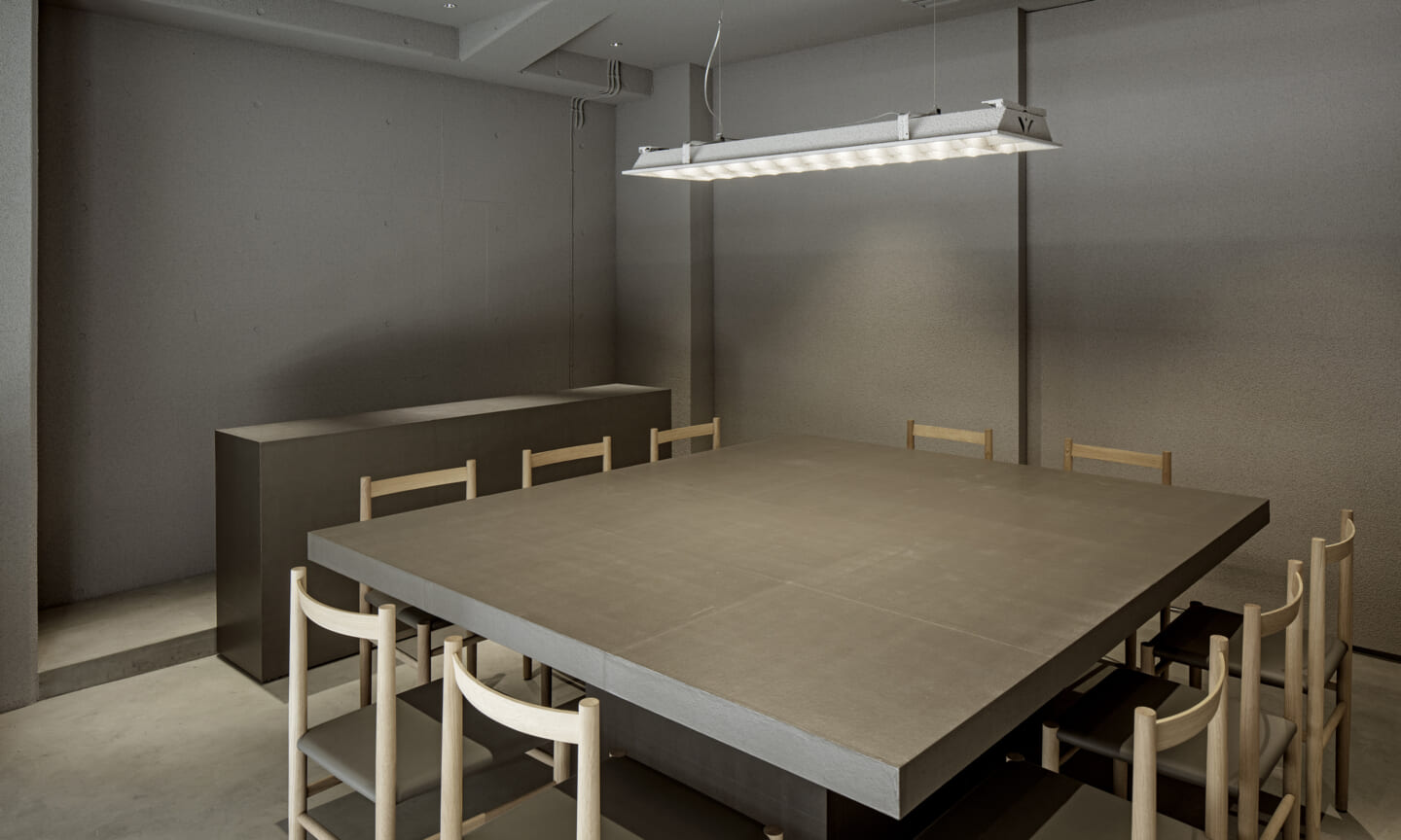 また、併設するワークショップスペースには、ハタノワタル氏による和紙の大テーブルとカウンター、既存蛍光灯をリメイクしたペンダントライトを設えた。空間に溶け込みながらも、手触りや光の陰影が、手を動かす人の感覚に働きかける。