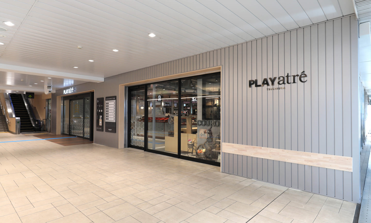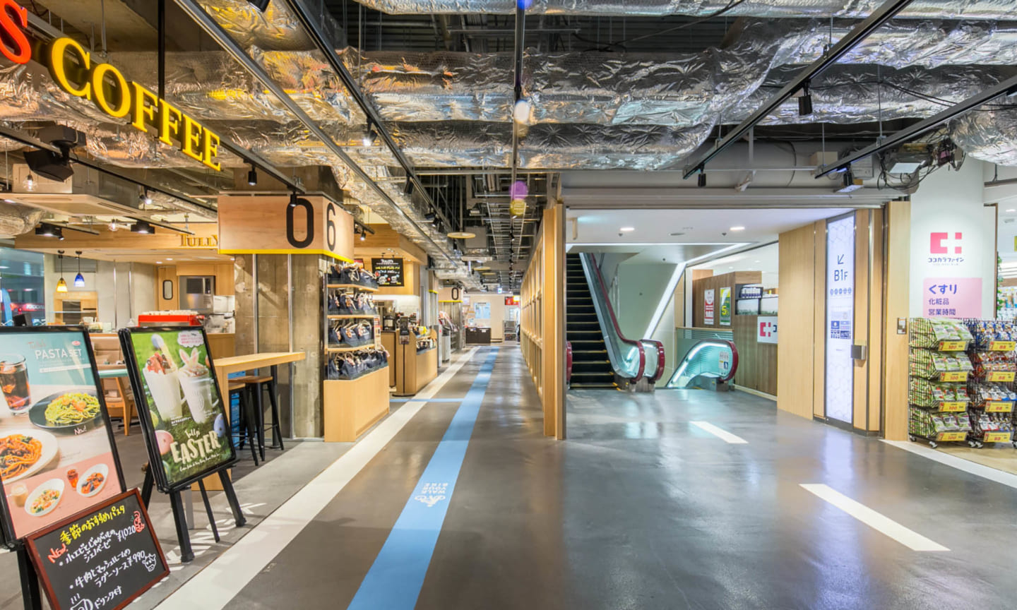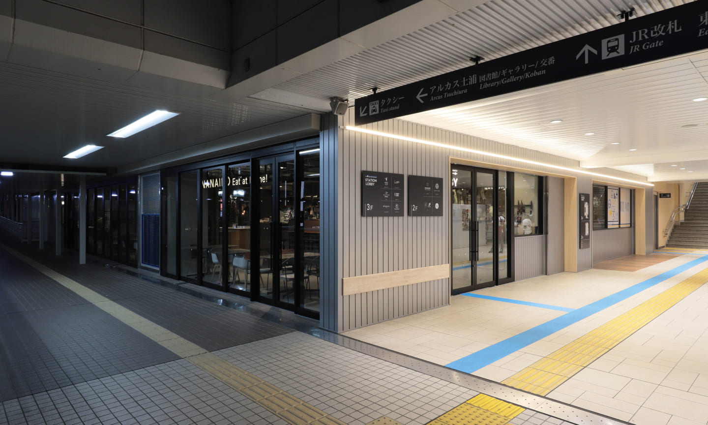 フードコート、カフェが並ぶ2Fフロアは滞留時間が長く、土浦駅出発、到着後のくつろぎを愉しむ場となるよう、施設利用者にとっては各エリアをつなぐ道、また駅利用者にとっての毎日の道となることから単なる通路とならないよう回遊性による引き込みを意識した道を設計した。