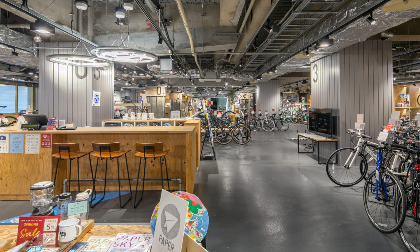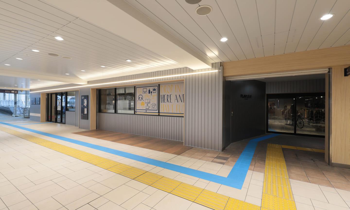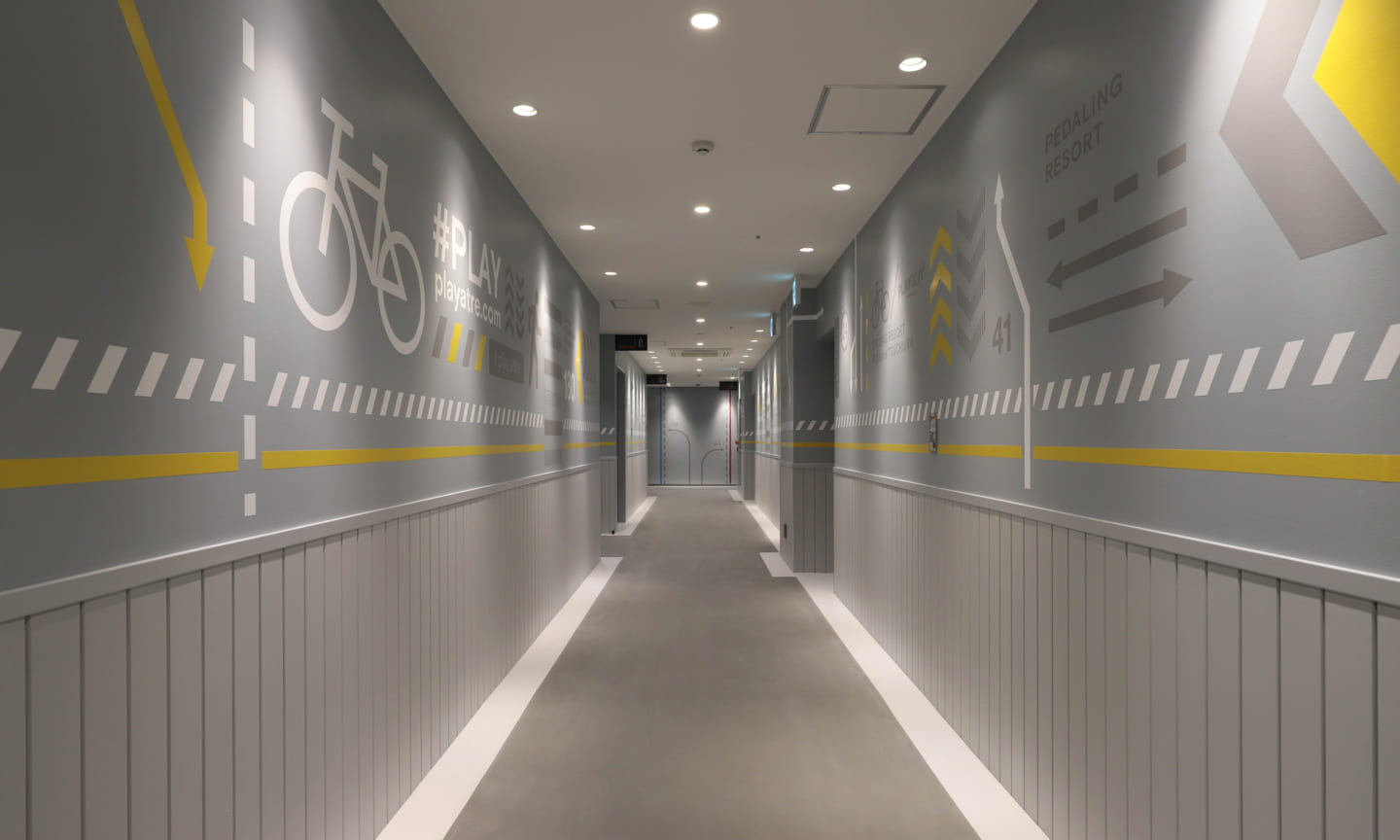 施設全体に自転車道路を示す床のブルーラインや道路標識をモチーフとして用い施設内を一気通貫する道をデザインし、各階においてはそれぞれのエリアが持つべき使われ方をTERMINAL・LOBY・PITという名前を付けそこからイメージする要素で空間を構築した。