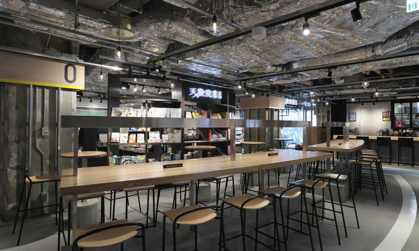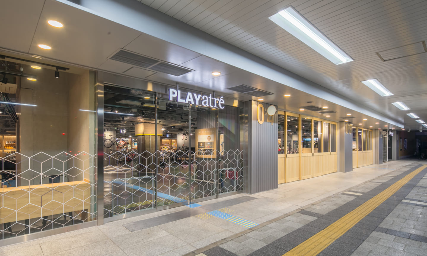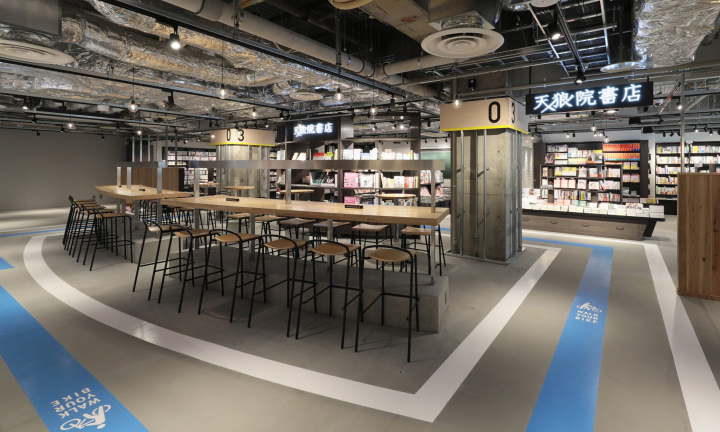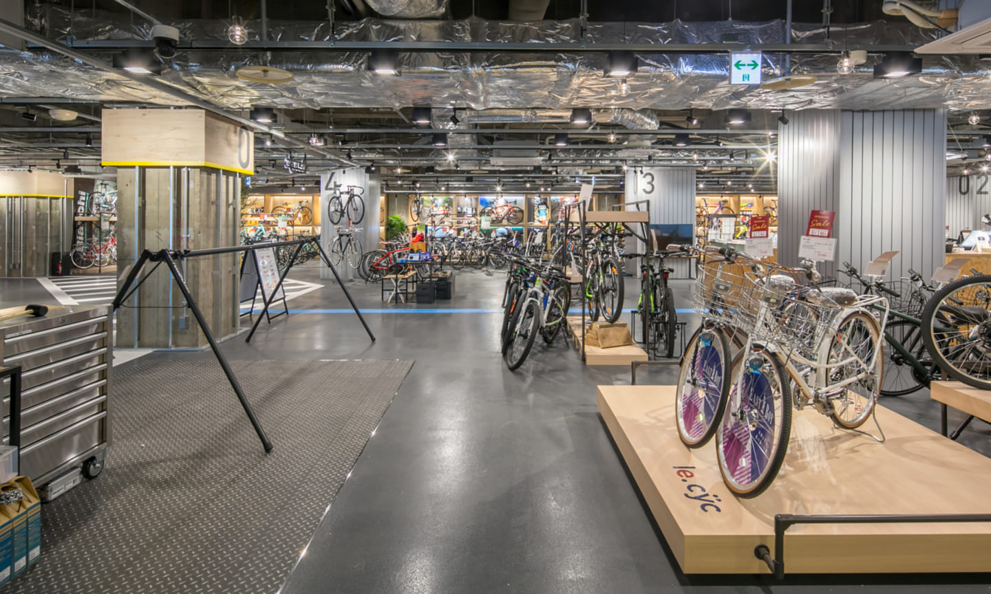 施設全体に自転車道路を示す床のブルーラインや道路標識をモチーフとして用い施設内を一気通貫する道をデザインし、各階においてはそれぞれのエリアが持つべき使われ方をTERMINAL・LOBY・PITという名前を付けそこからイメージする要素で空間を構築した。