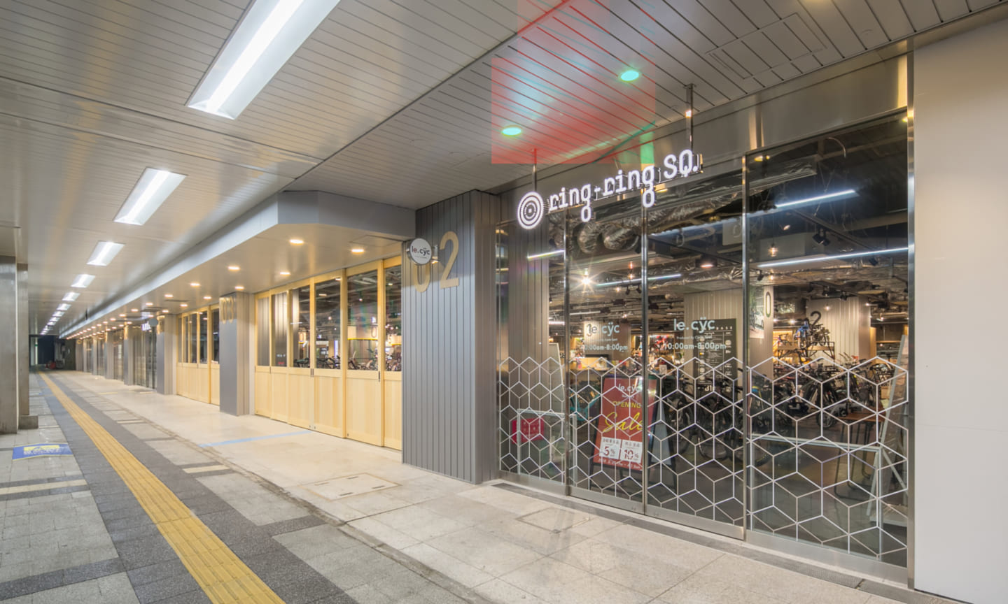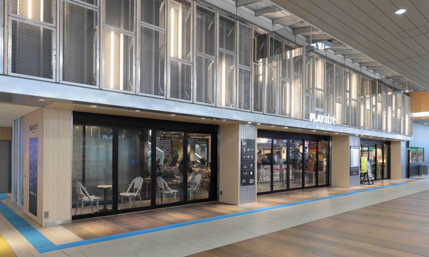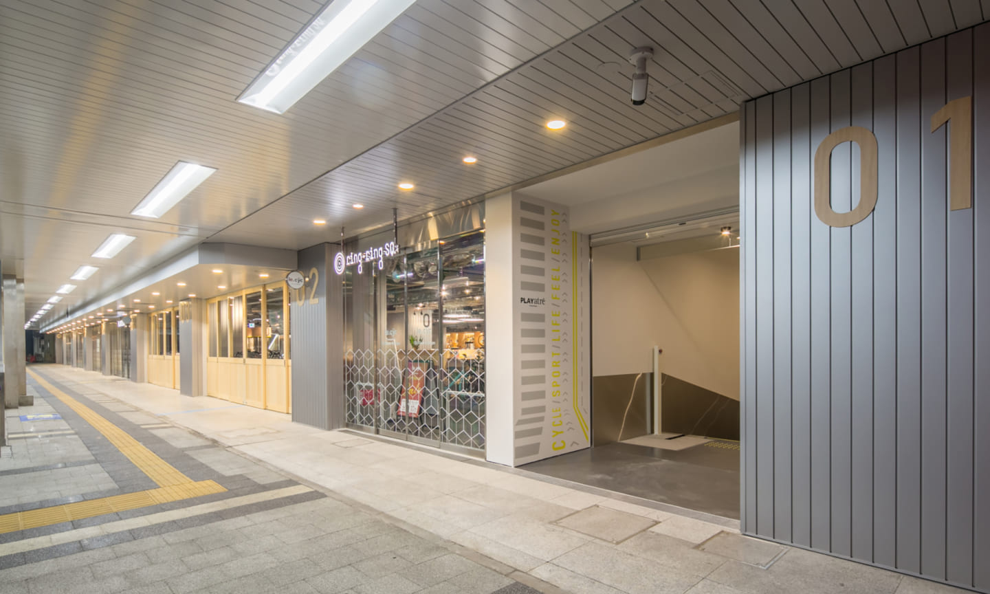 サイクリングステーションやコンビニ、ドラッグストアなどが連なるファサードは、滞留時間も短く出発に向けた一時的な準備をする場に見合ったデザインとしてピットをモチーフに数字や柱の連続性の表現で街と施設をシームレスにつなぐ寄り道の出来る止まり木のような場所とした。サイクルステーションと共有部間に余白を設け輪行の自転車の組み立てやメンテナンスの場としての活用を提案し出発準備の場に見合う新たな機能と風景をつくりをしている。