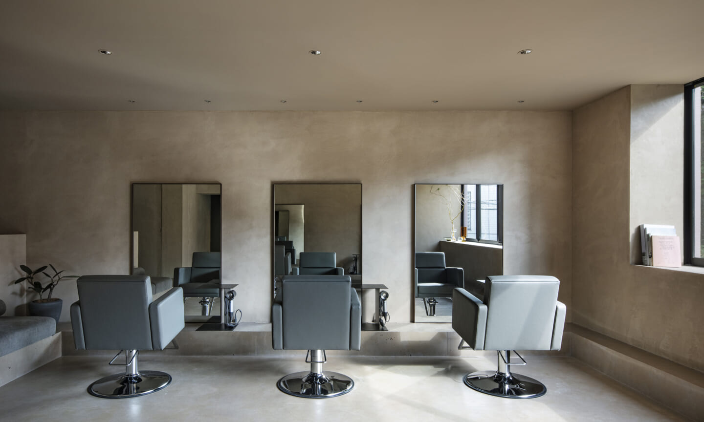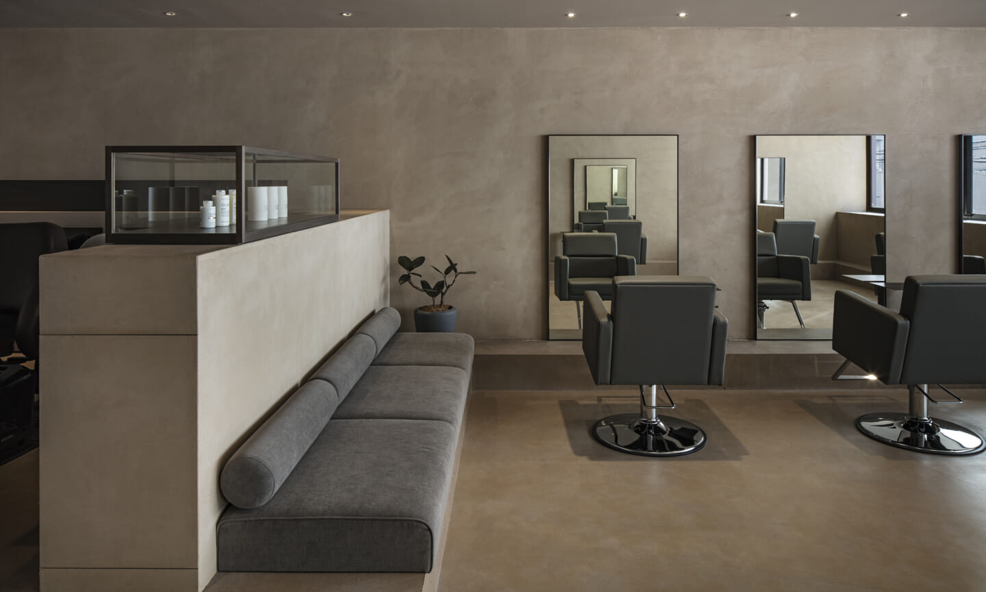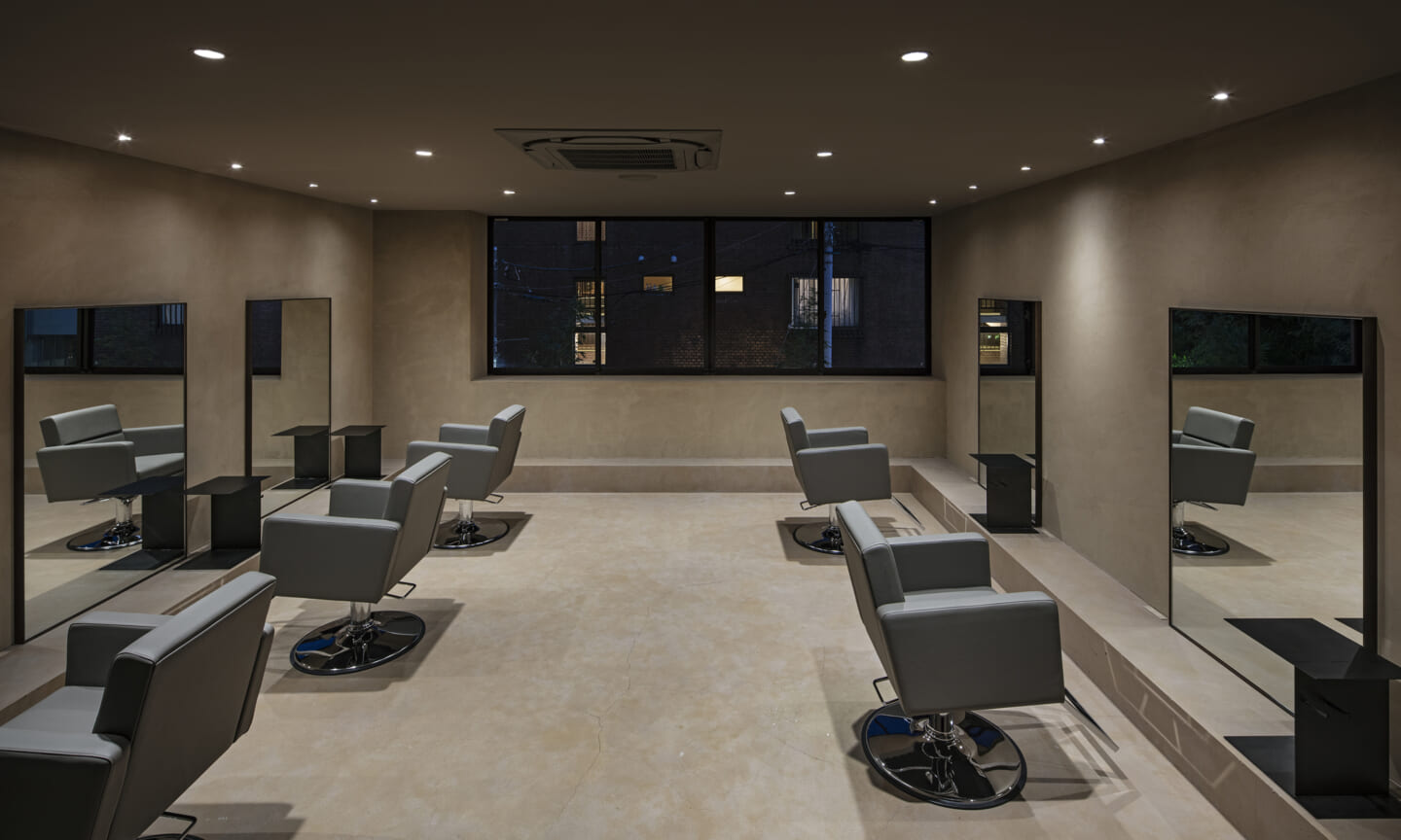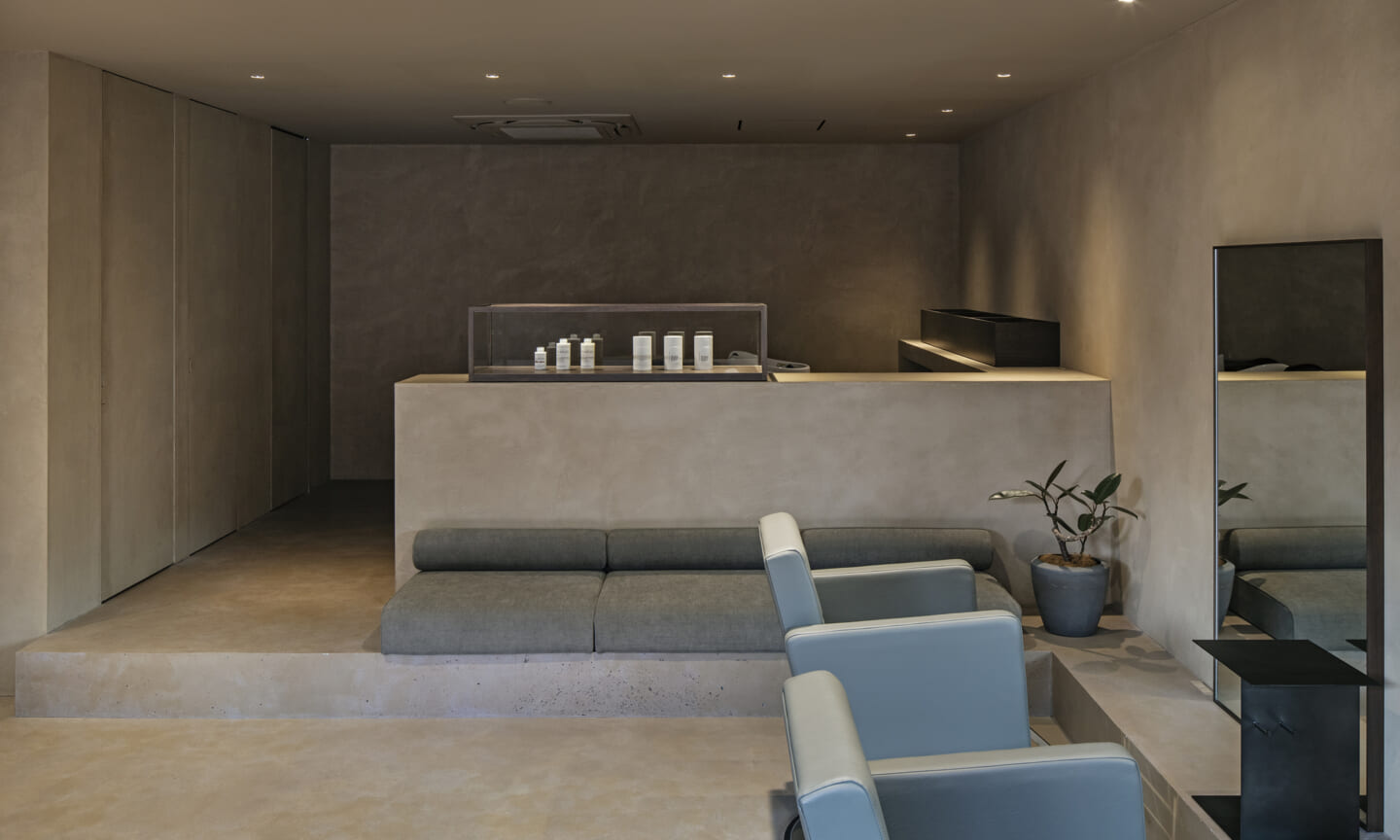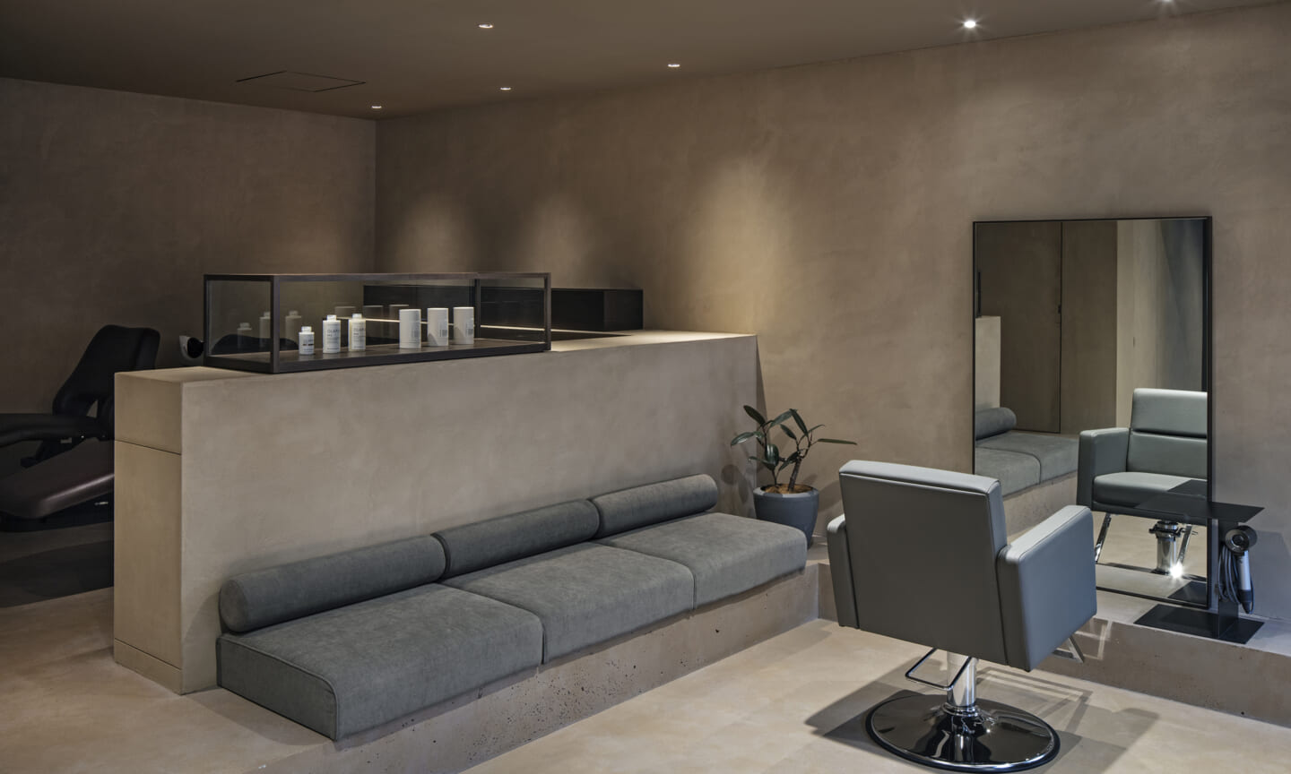 内装は、壁と什器にベージュの素材感のある左官を基調とし、天井と床は素材を変えながらもトーンを揃えることで、洞穴のような包まれ方をつくっている。床の高低差は、小上がりやベンチ、カウンター、棚へと連続し、室内に「地形」を立ち上げる。段差や塊は、領域をやわらかく分けながら、人や家具の居場所をつくり出す。また、収納や手掛けは背景に溶け込む納まりとし、視界のノイズを抑えることで、都市の情報量から解放される状態を整えた。その中に、馴染みながらも繊細な存在感をもつ家具を点在させ、ミニマムで洗練された印象を与えている。将来的に加わるクライアントの設えやヘアスタイルを引き立てる、背景としての器でもある。