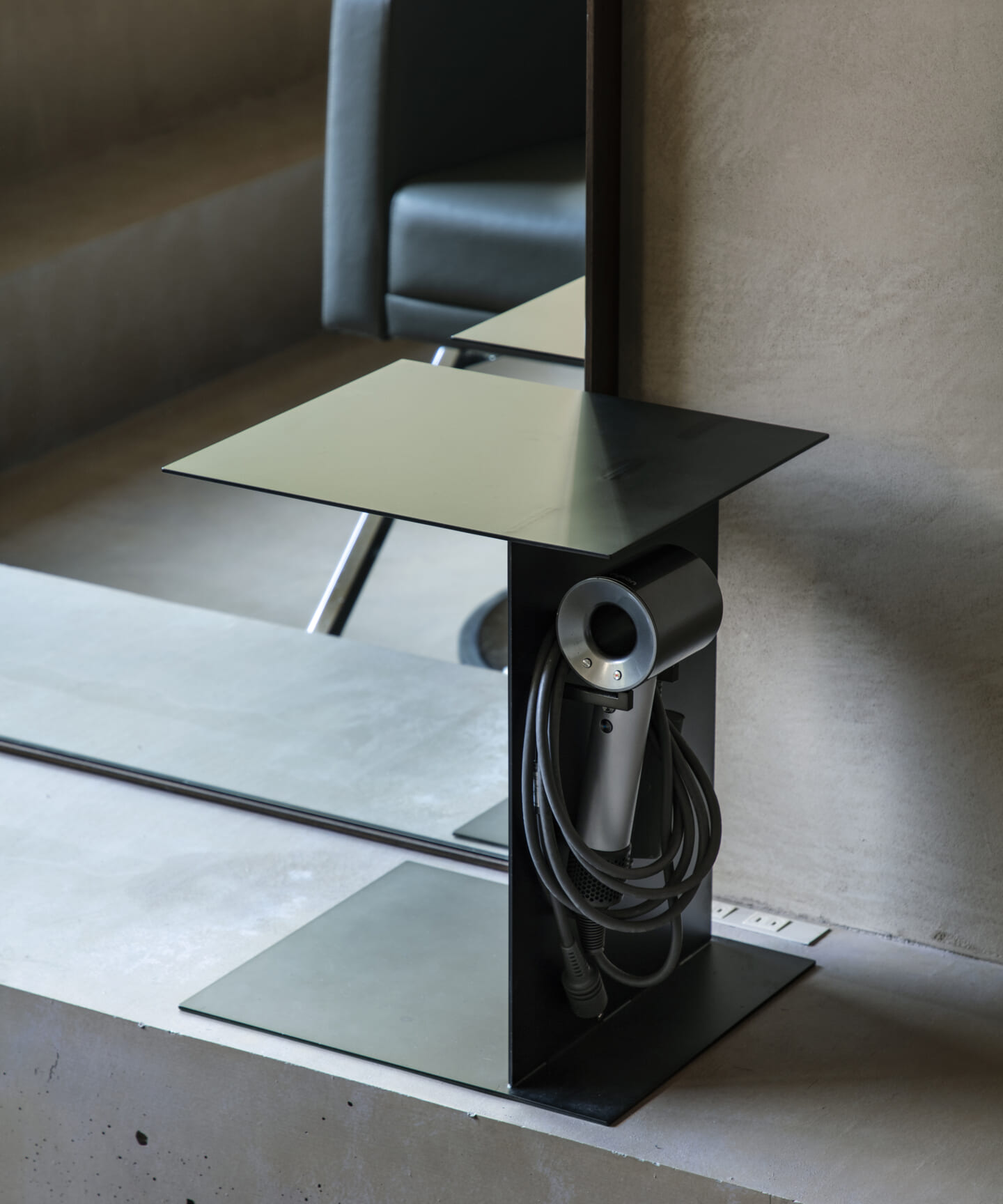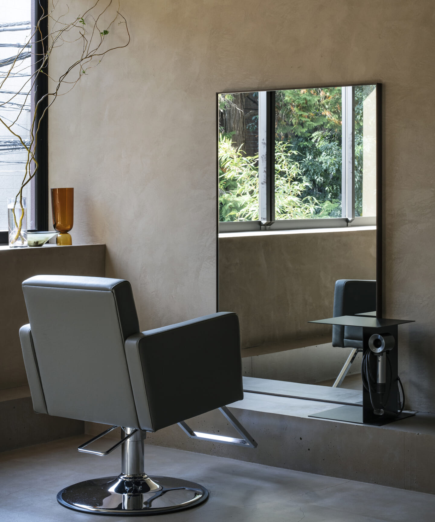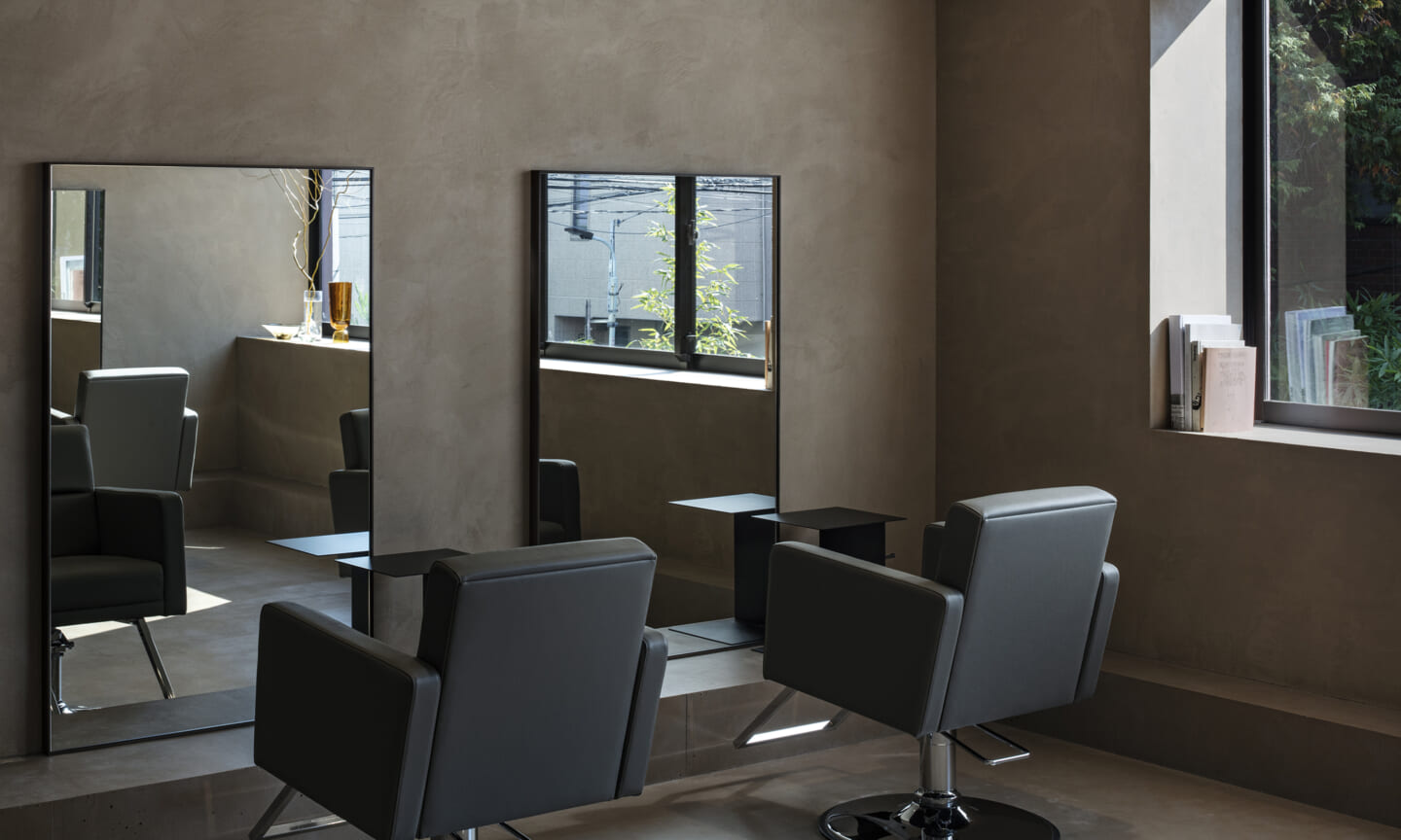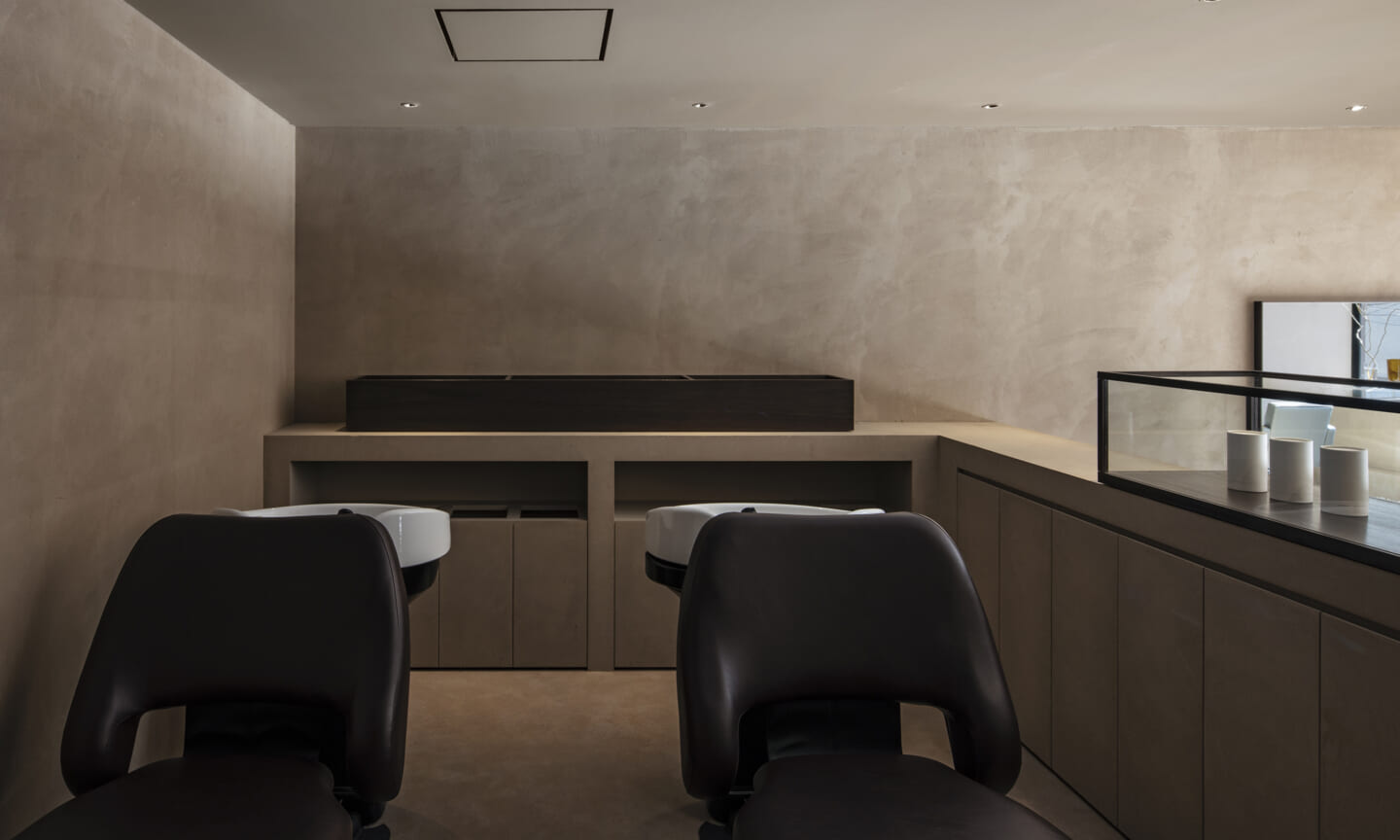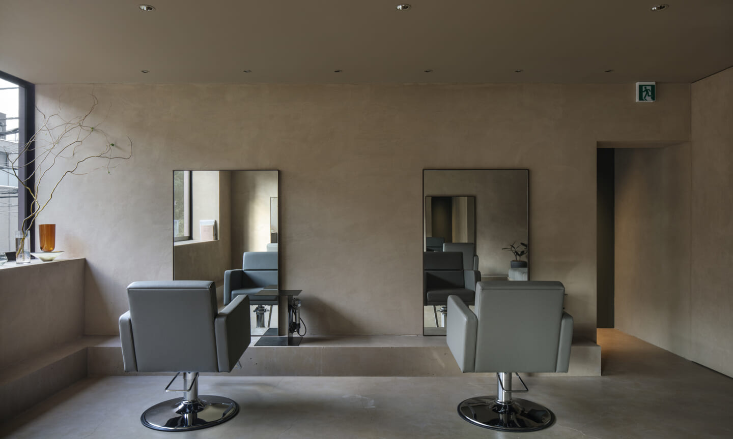 内装は、壁と什器にベージュの素材感のある左官を基調とし、天井と床は素材を変えながらもトーンを揃えることで、洞穴のような包まれ方をつくっている。床の高低差は、小上がりやベンチ、カウンター、棚へと連続し、室内に「地形」を立ち上げる。段差や塊は、領域をやわらかく分けながら、人や家具の居場所をつくり出す。また、収納や手掛けは背景に溶け込む納まりとし、視界のノイズを抑えることで、都市の情報量から解放される状態を整えた。その中に、馴染みながらも繊細な存在感をもつ家具を点在させ、ミニマムで洗練された印象を与えている。将来的に加わるクライアントの設えやヘアスタイルを引き立てる、背景としての器でもある。