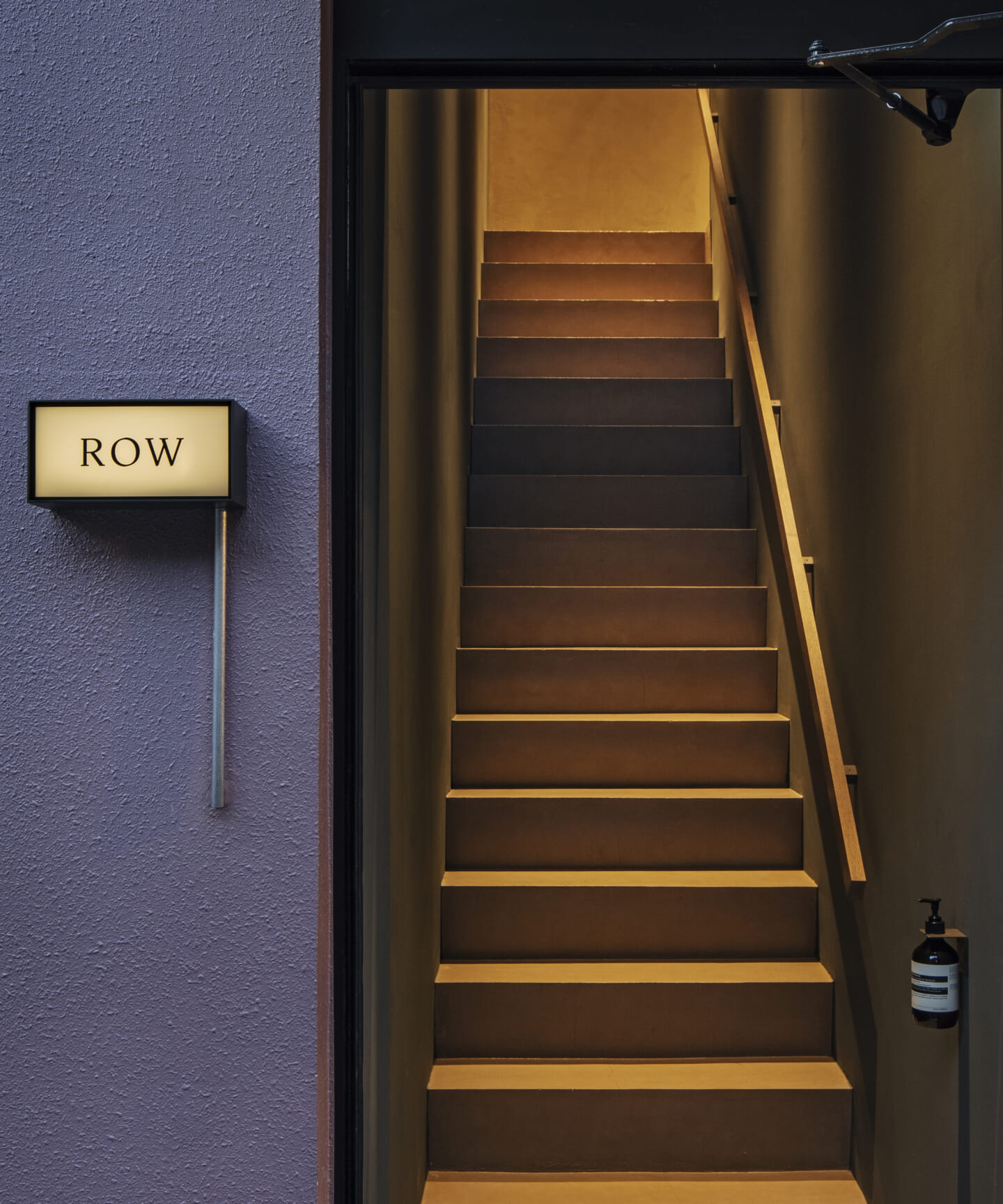 一方、エントランスの階段室は、サロン内部とは色調を切り替えつつ、内外装の仕上げと調和するトーンの中から、この店の世界観に合うグリーンを選定した。街の喧騒から切り離された洞穴のような空間へ向かう、切り替えと高揚感を感じさせるアプローチとしている。