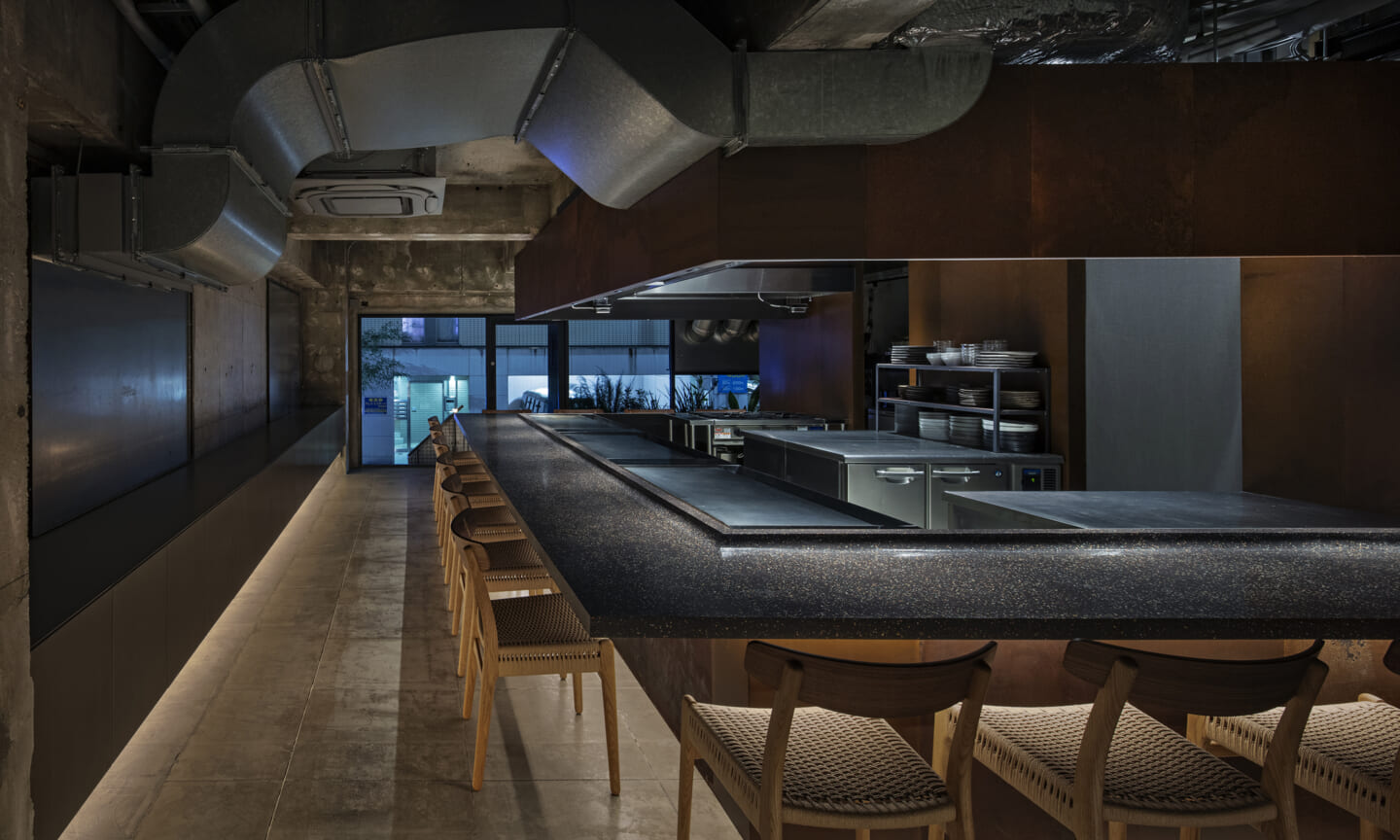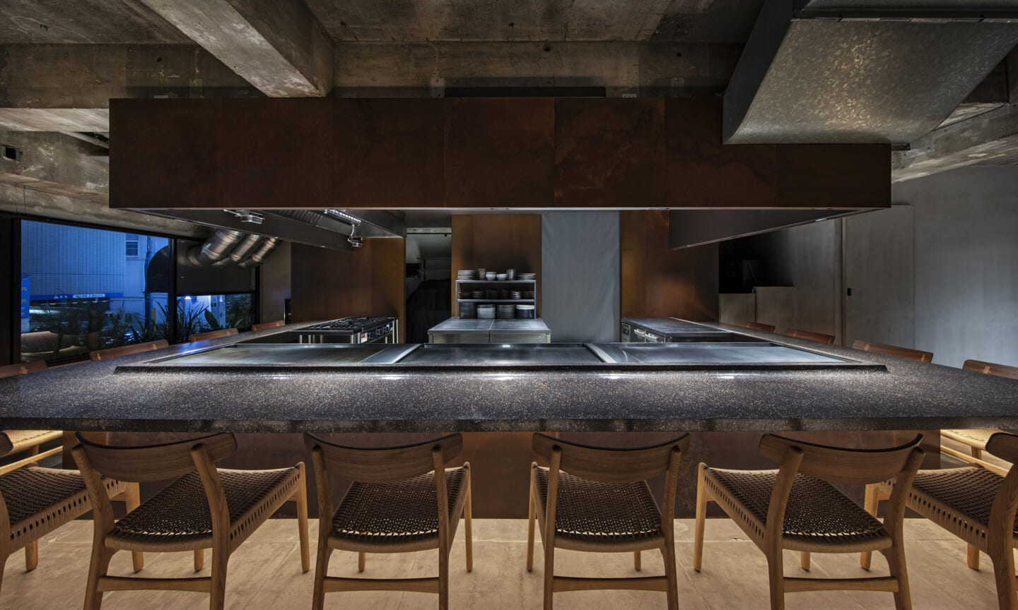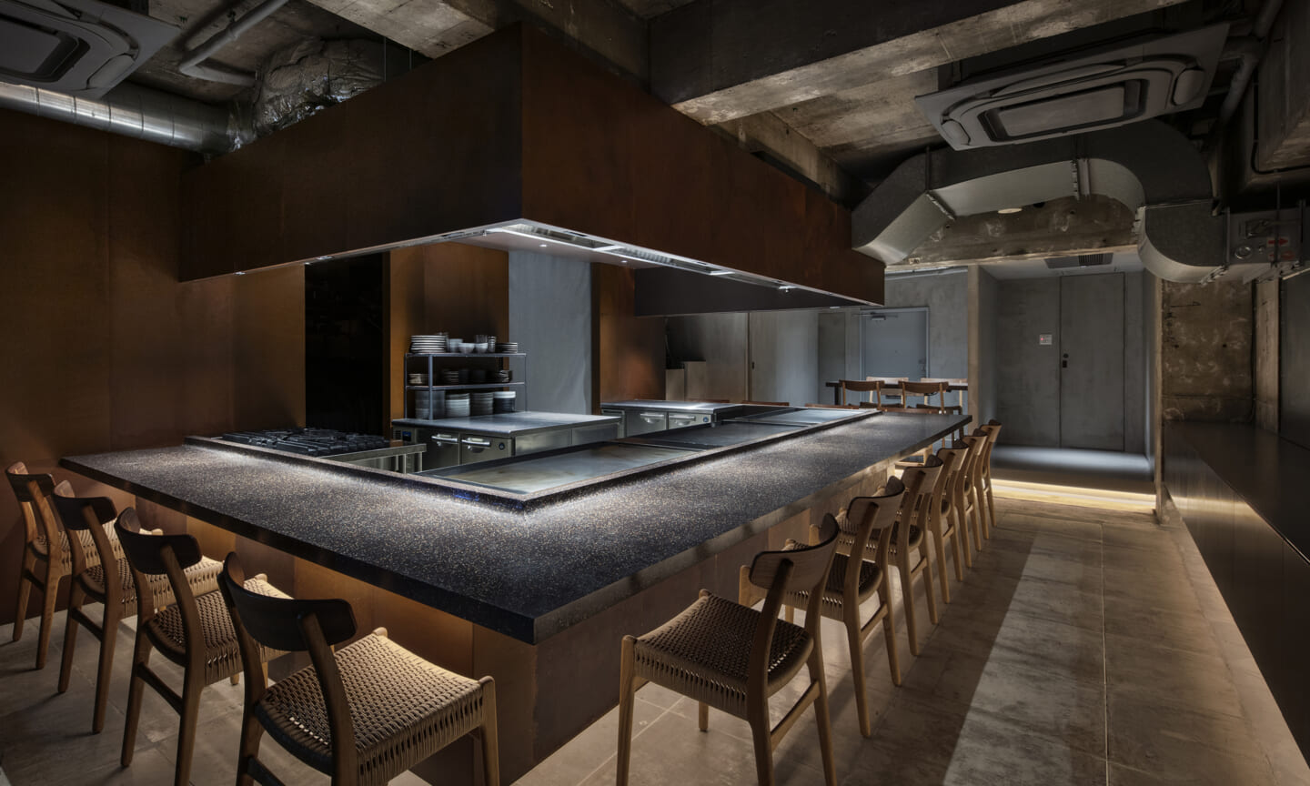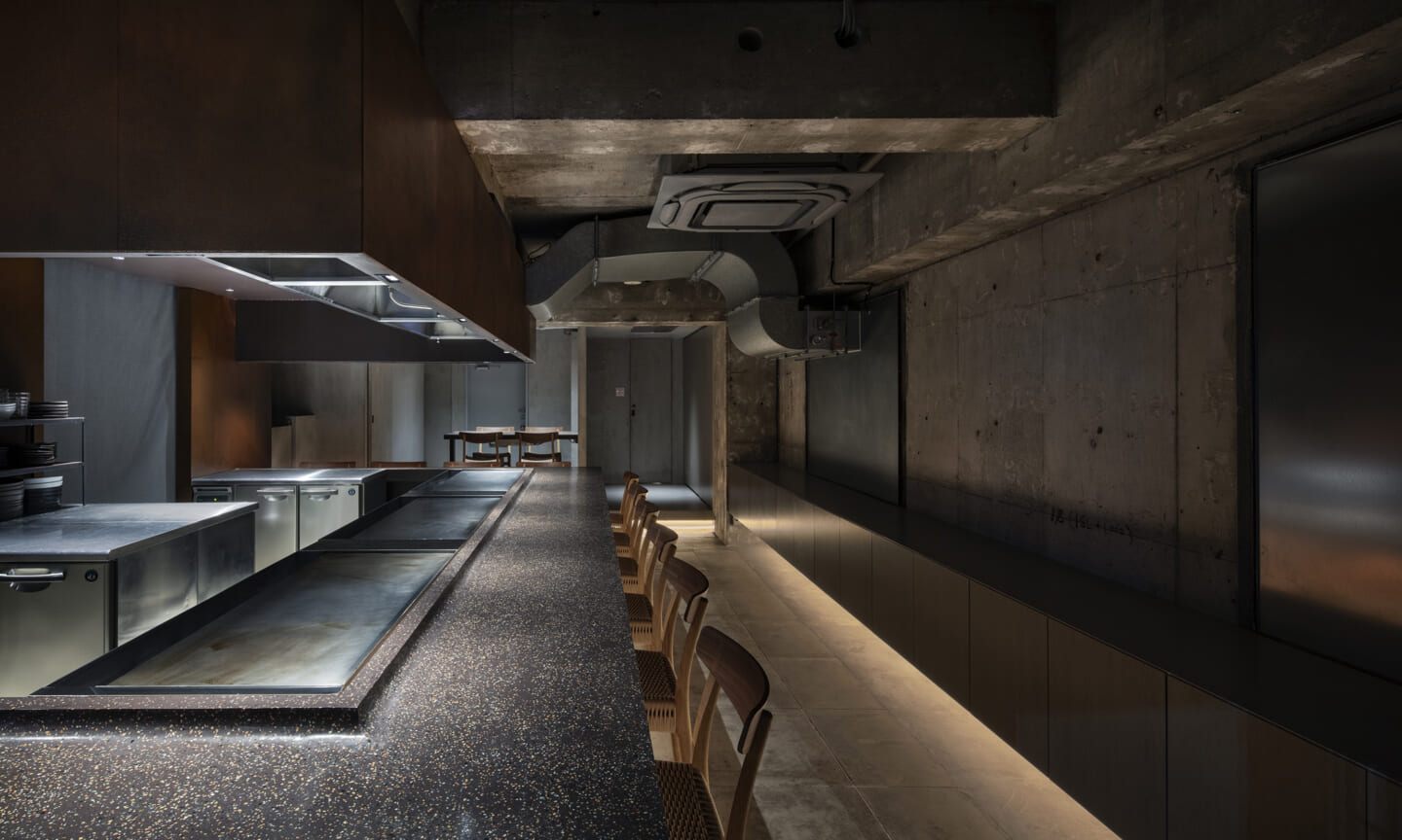 鉄板料理の醍醐味は目の前の鉄板での調理を見る楽しさにある。調理が主役となるようキッチンを中心にそこを囲むようコの字型のカウンターを配置、マテリアルは調理で使う鉄板と同素材である“鉄”を加工したコールテン鋼で仕上げた。また同系色の砕石を調合した天板のテラゾは現場で研磨し調理の鉄板と客席カウンターに生まれた段差を緩やかにアールで繋ぐディテールに。厨房と客席とのフラットな構成や、目線が合いやすいカウンター形状で空間に一体感が生まれ料理を待つ時間の豊かにつながるよう意図した。
