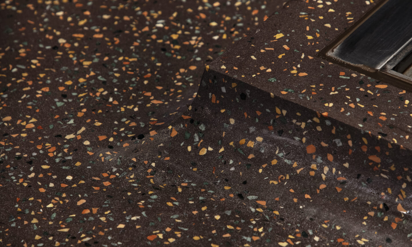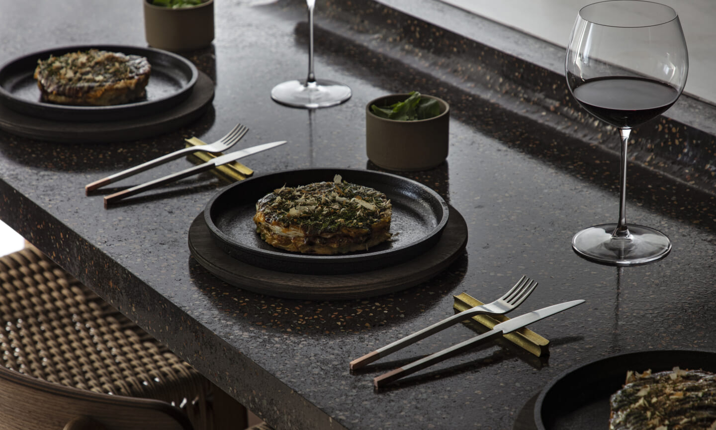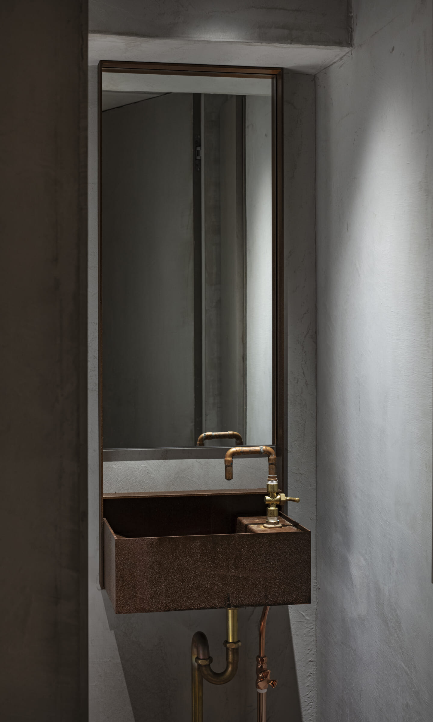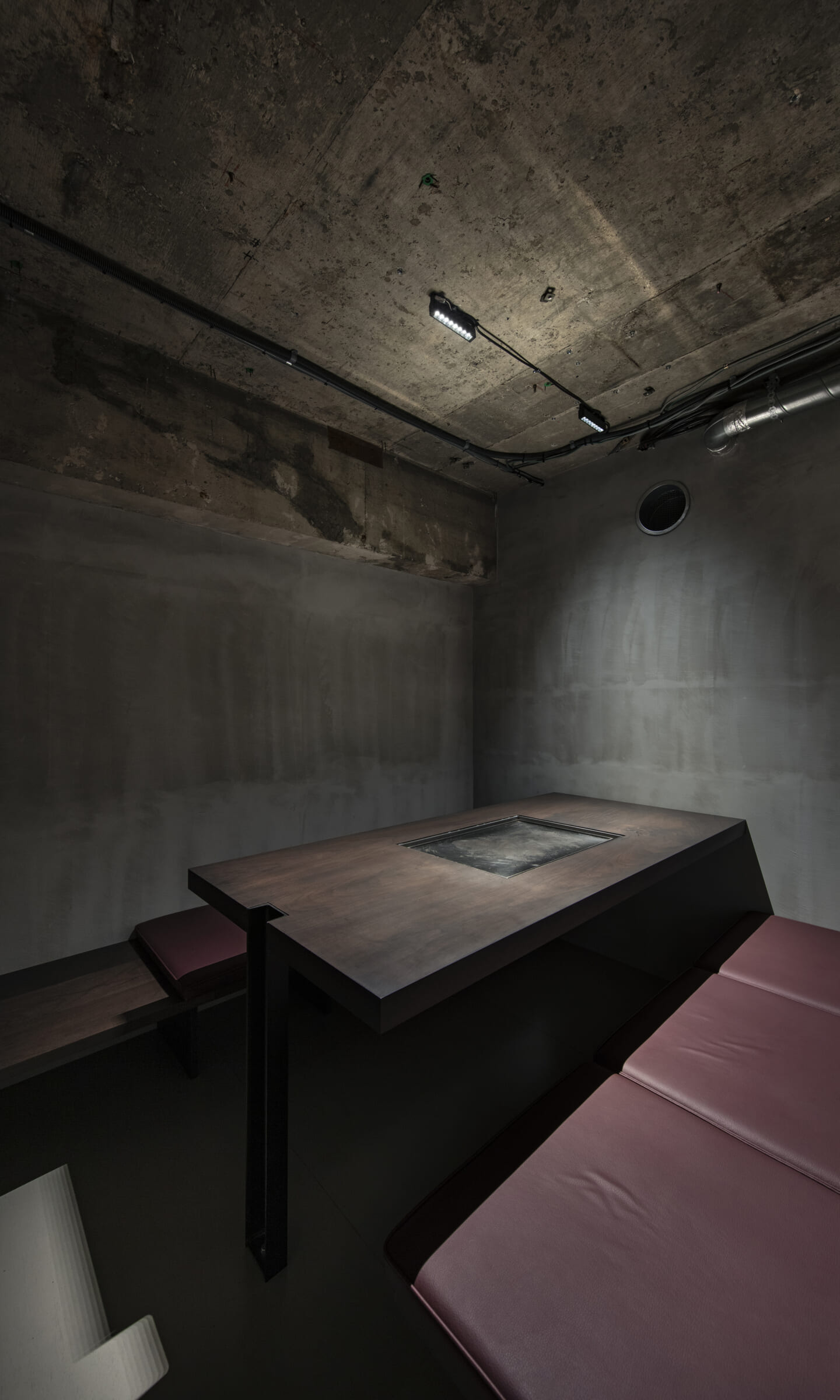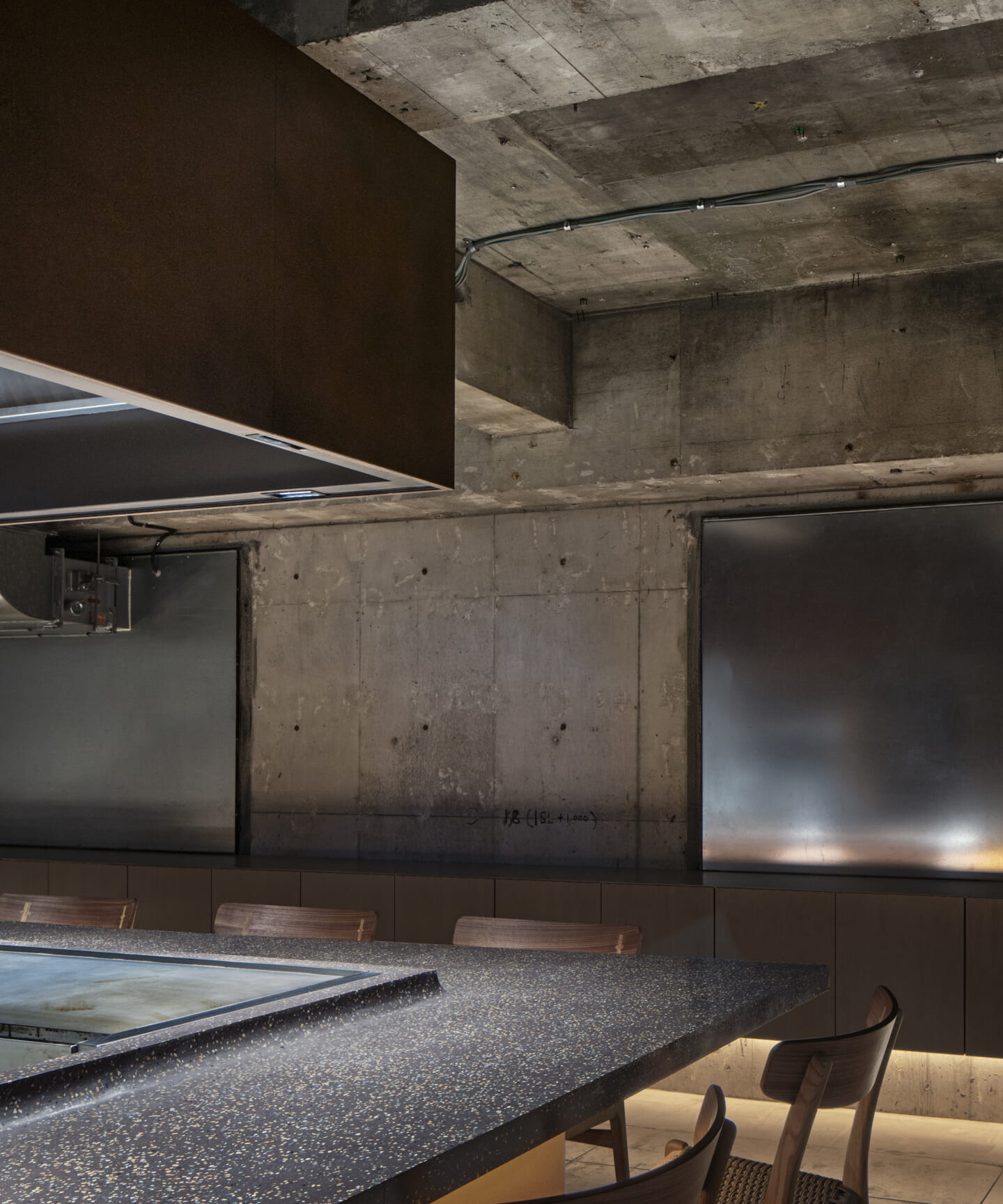 鉄板料理の醍醐味は目の前の鉄板での調理を見る楽しさにある。調理が主役となるようキッチンを中心にそこを囲むようコの字型のカウンターを配置、マテリアルは調理で使う鉄板と同素材である“鉄”を加工したコールテン鋼で仕上げた。また同系色の砕石を調合した天板のテラゾは現場で研磨し調理の鉄板と客席カウンターに生まれた段差を緩やかにアールで繋ぐディテールに。厨房と客席とのフラットな構成や、目線が合いやすいカウンター形状で空間に一体感が生まれ料理を待つ時間の豊かにつながるよう意図した。