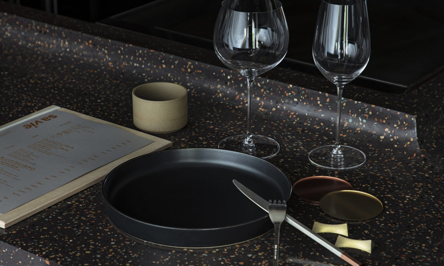 “鉄と錆”のマテリアルは店名のSavieとも連動しこのレストランの印象を視覚的に伝える役割も担っている。それらのカラースキームはサインやグラフィック、食器やカトラリーといったテーブルウェアにも展開させ細部の色彩の集積からなる空間の調和を図った。