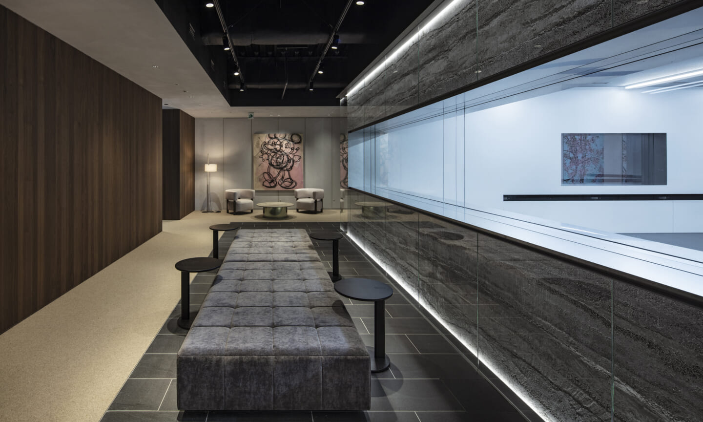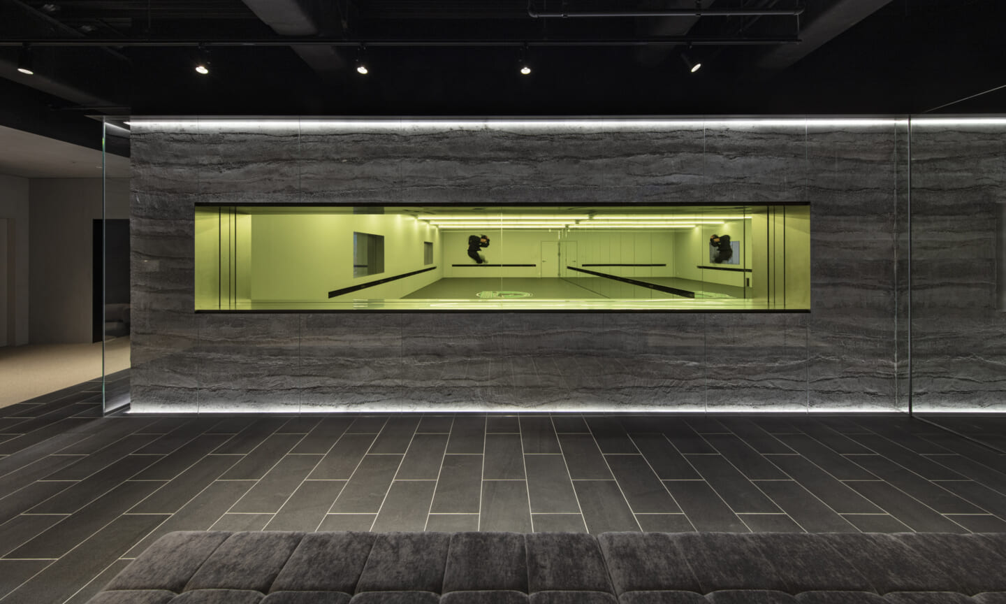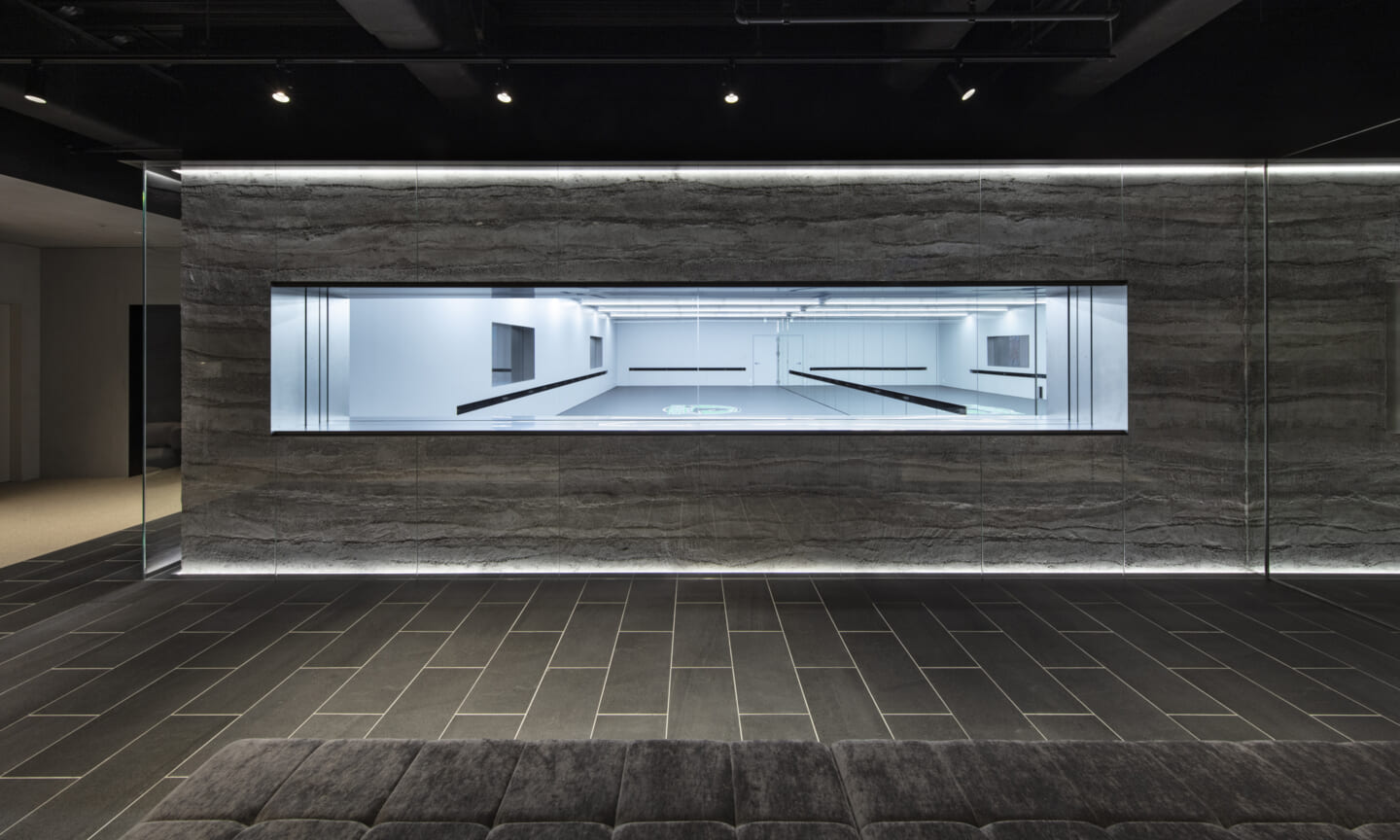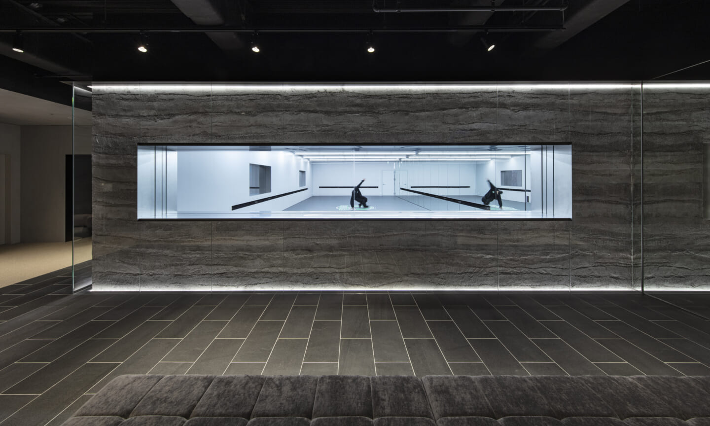 計画の要であるダンススタジオは、来客フロアの中心に配置した。版築左官壁の量塊をガラスで包み込み、間接照明によって柔らかく浮かび上がらせている。待合や通路に設けた開口部からは、内部のダンスの様子がアートのように切り取られ、点在するアート作品と呼応しながら、空間全体にギャラリーのような空気感をもたらす。一方、ダンススタジオからは、来客フロアの風景が対景として印象的に立ち上がる。