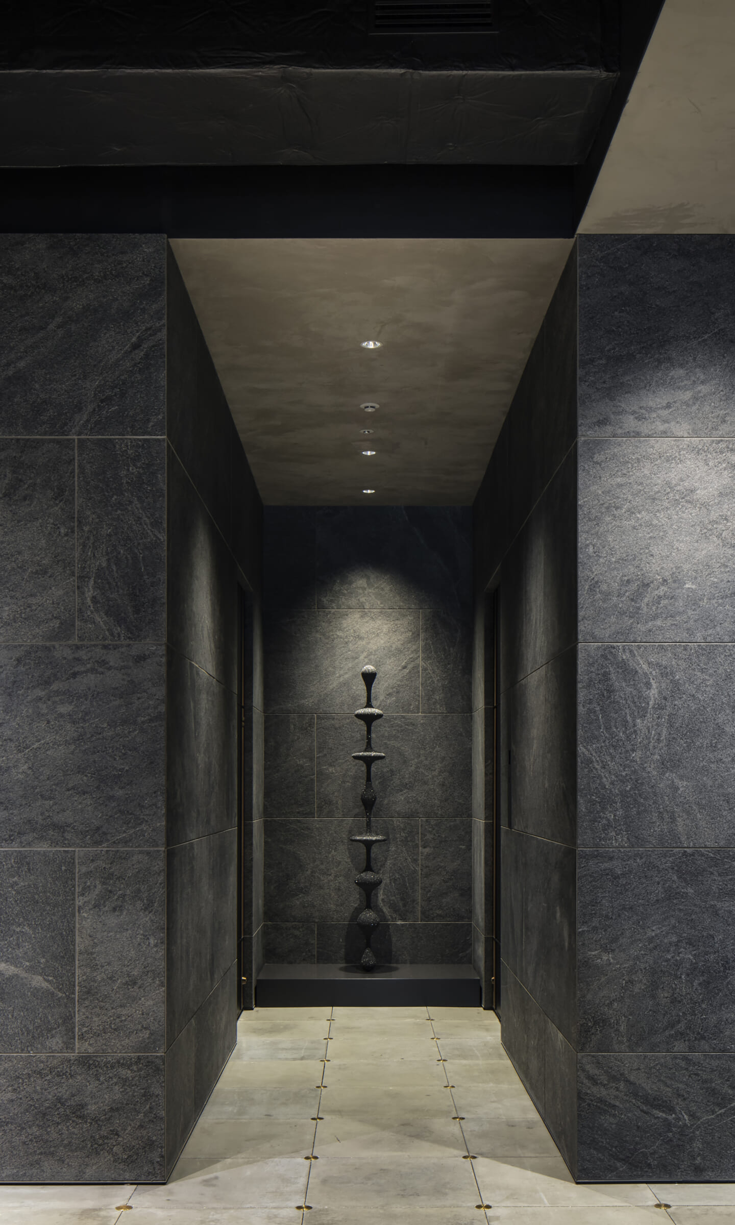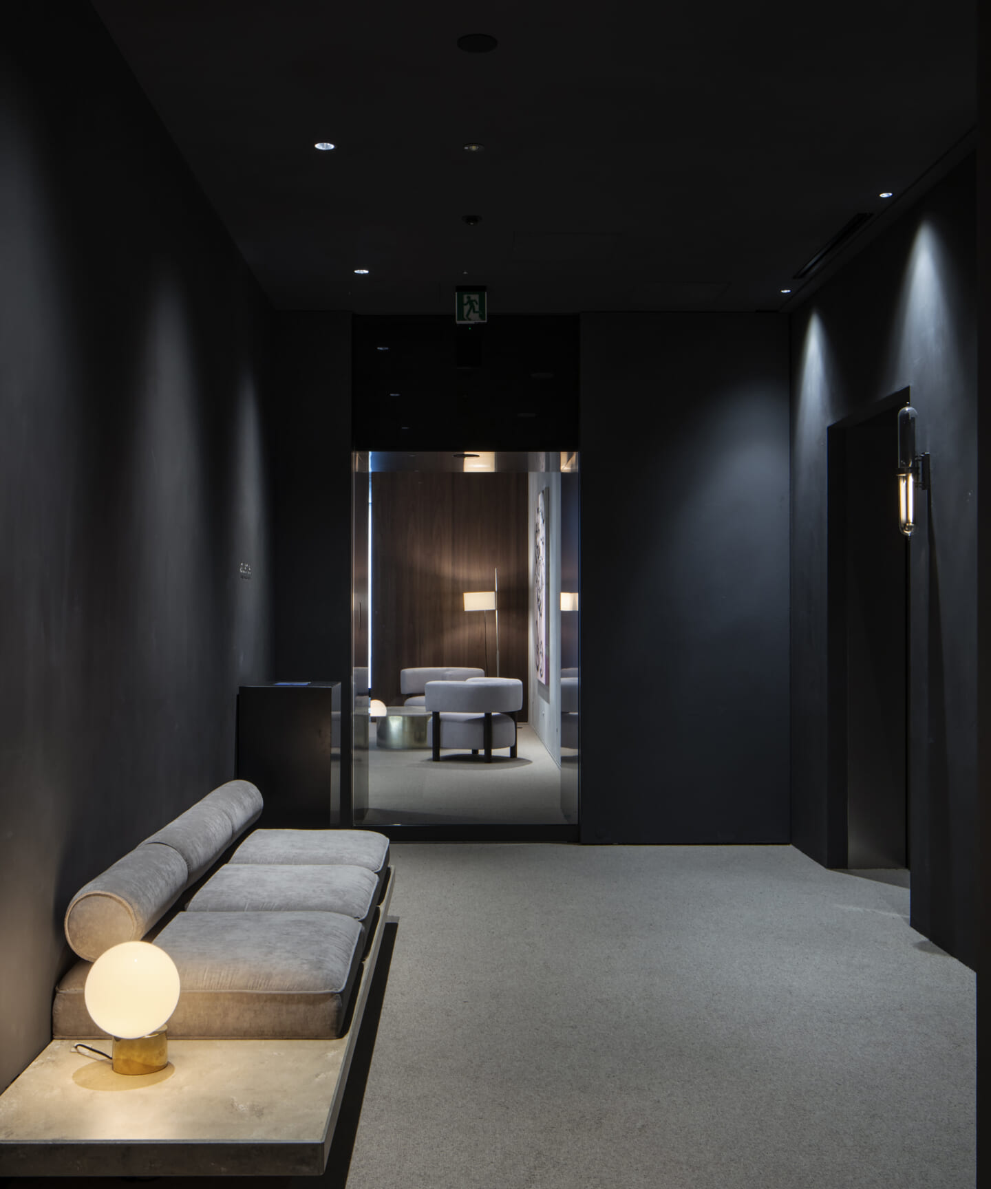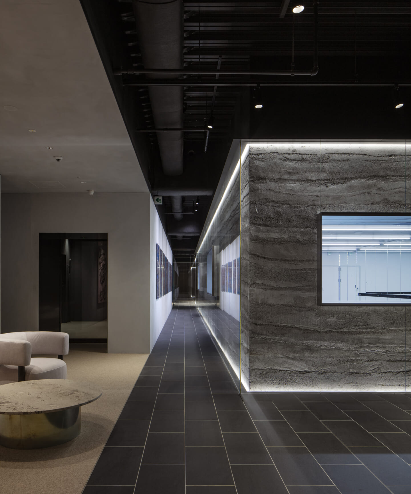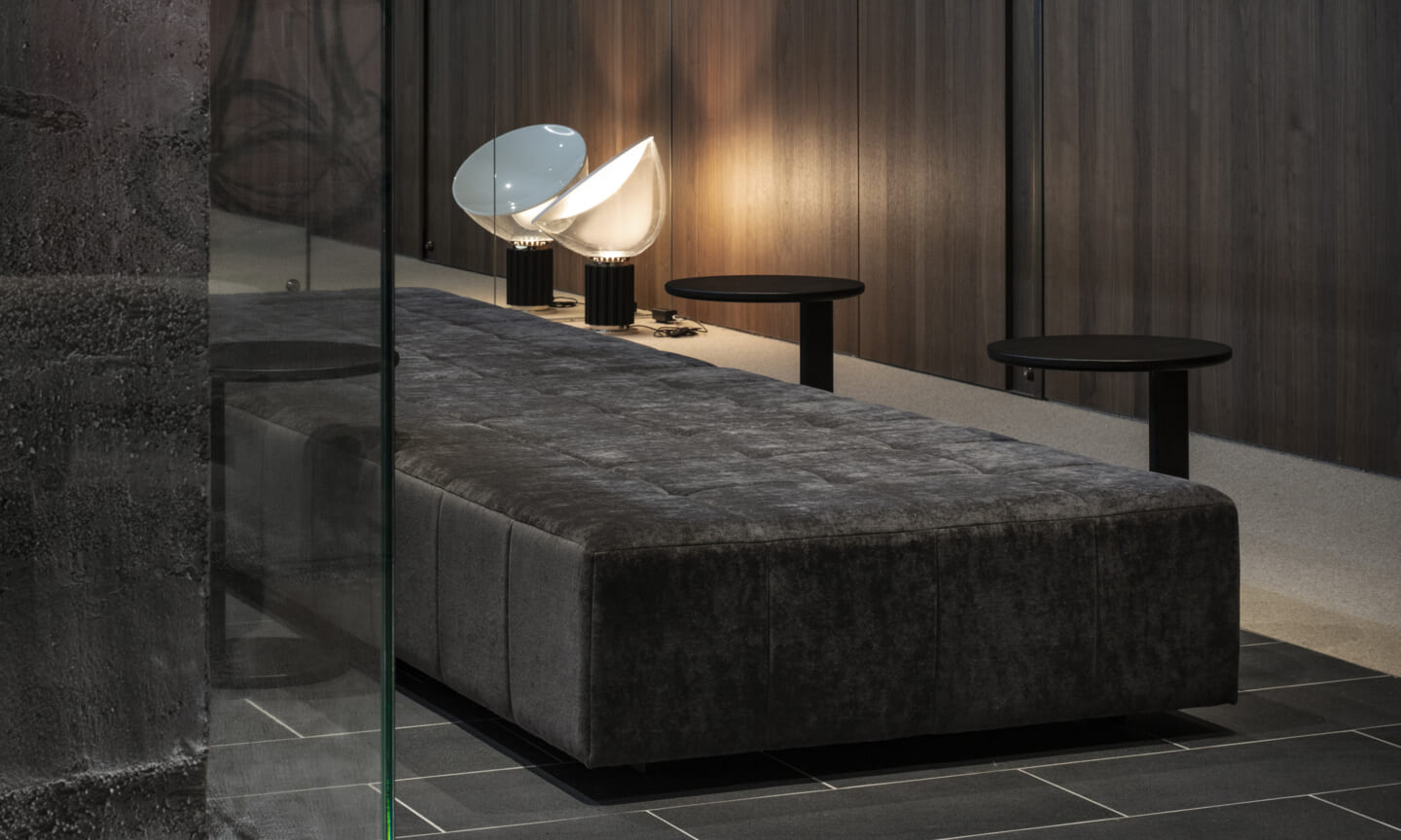 計画の要であるダンススタジオは、来客フロアの中心に配置した。版築左官壁の量塊をガラスで包み込み、間接照明によって柔らかく浮かび上がらせている。待合や通路に設けた開口部からは、内部のダンスの様子がアートのように切り取られ、点在するアート作品と呼応しながら、空間全体にギャラリーのような空気感をもたらす。一方、ダンススタジオからは、来客フロアの風景が対景として印象的に立ち上がる。