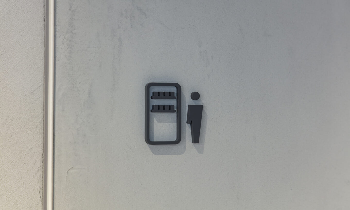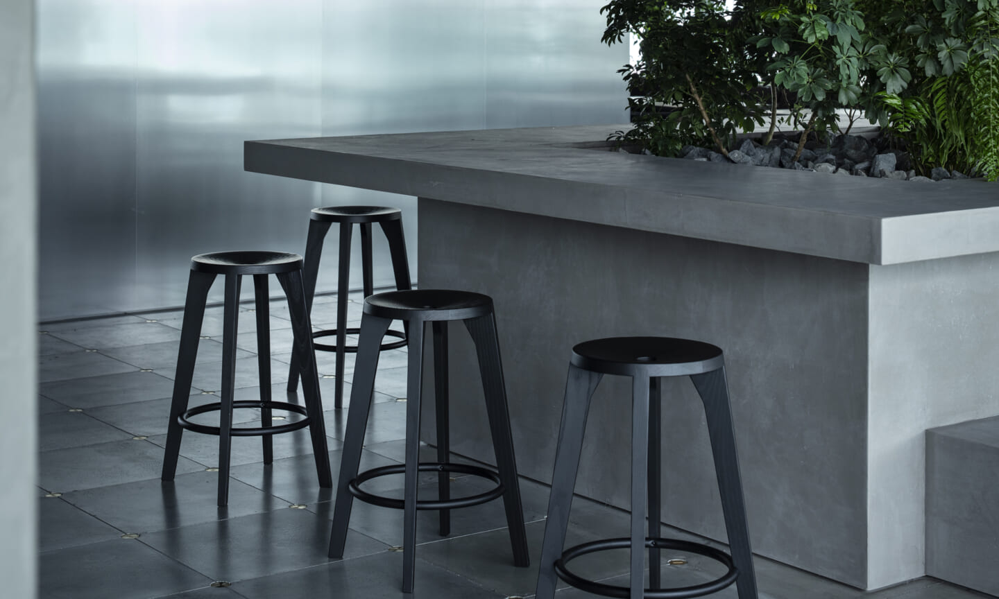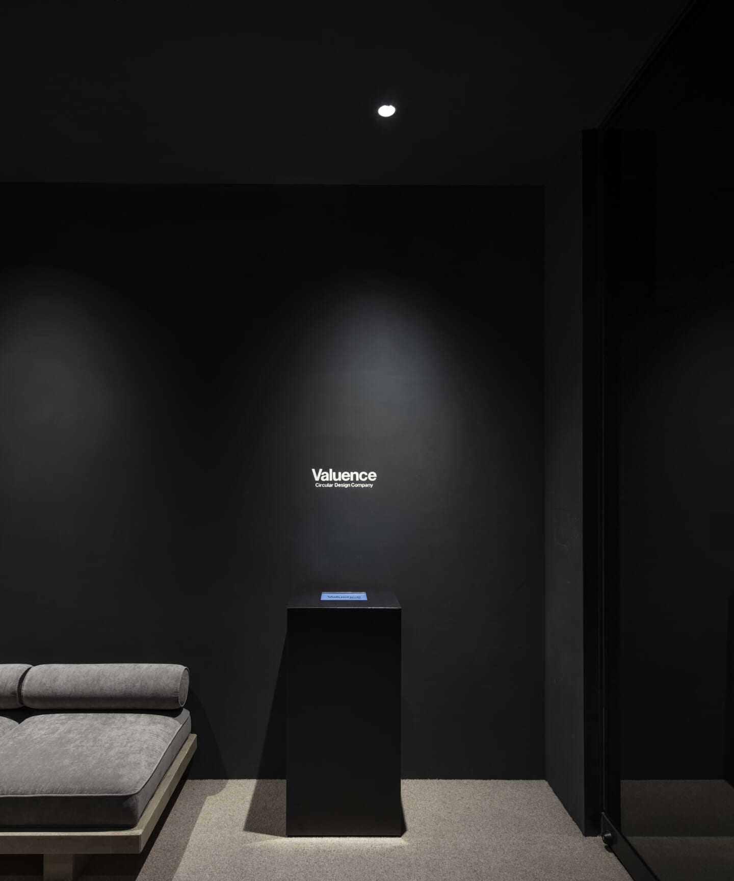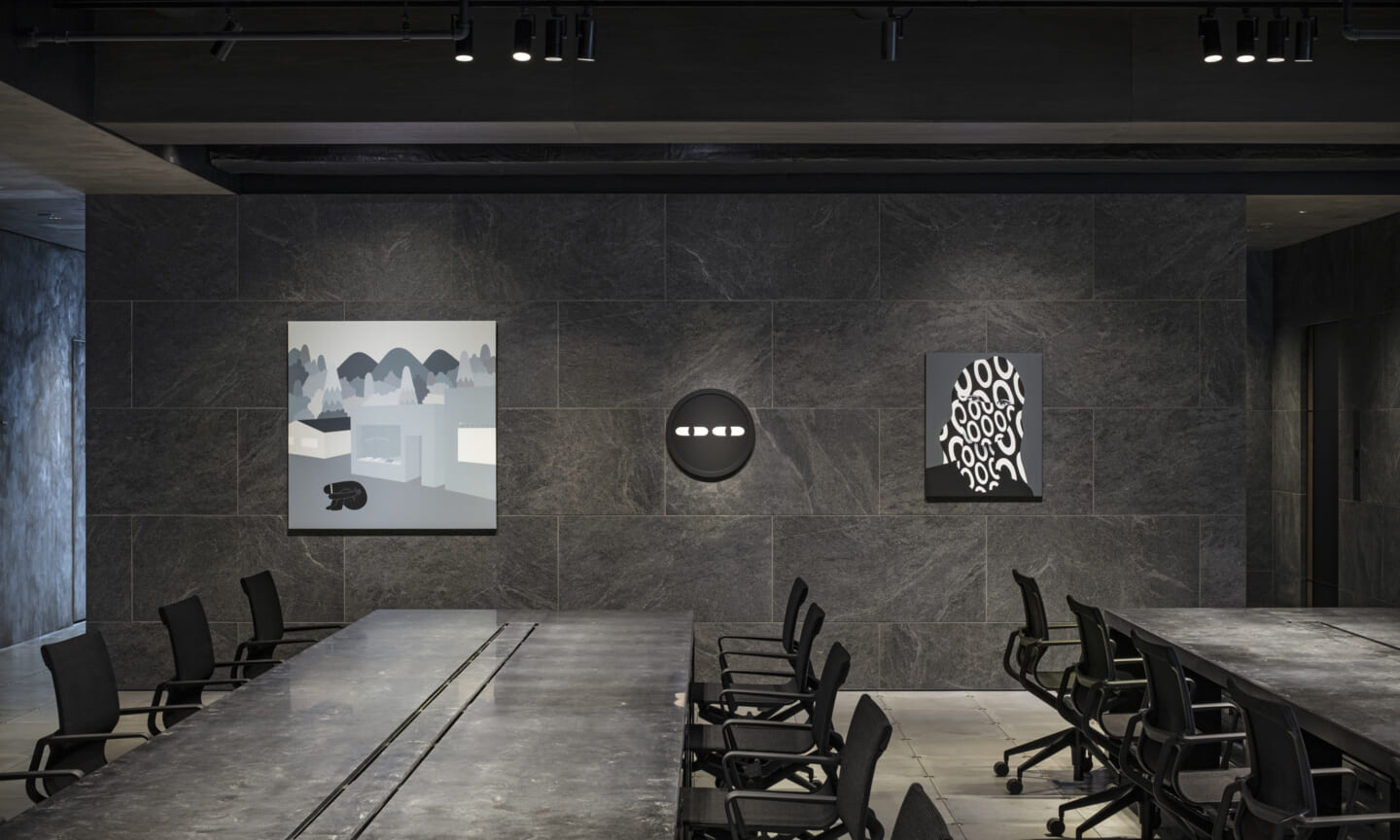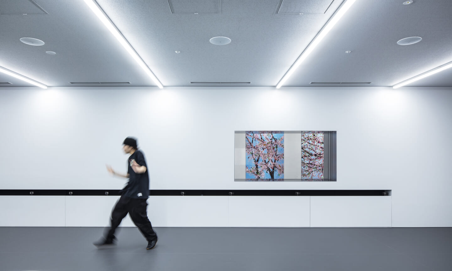 計画の軸としたのは、「見る/見られる」という関係性である。モノトーンを基調とした空間に、素材や色、構成の対比によるコントラストを与えることで、ダンスの風景、社員が働く風景、既存のアート作品が明確な対象として立ち上がる構成とした。