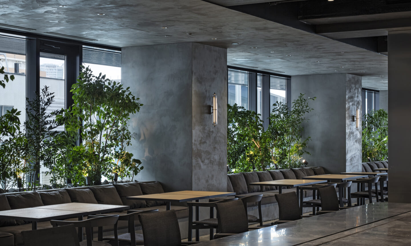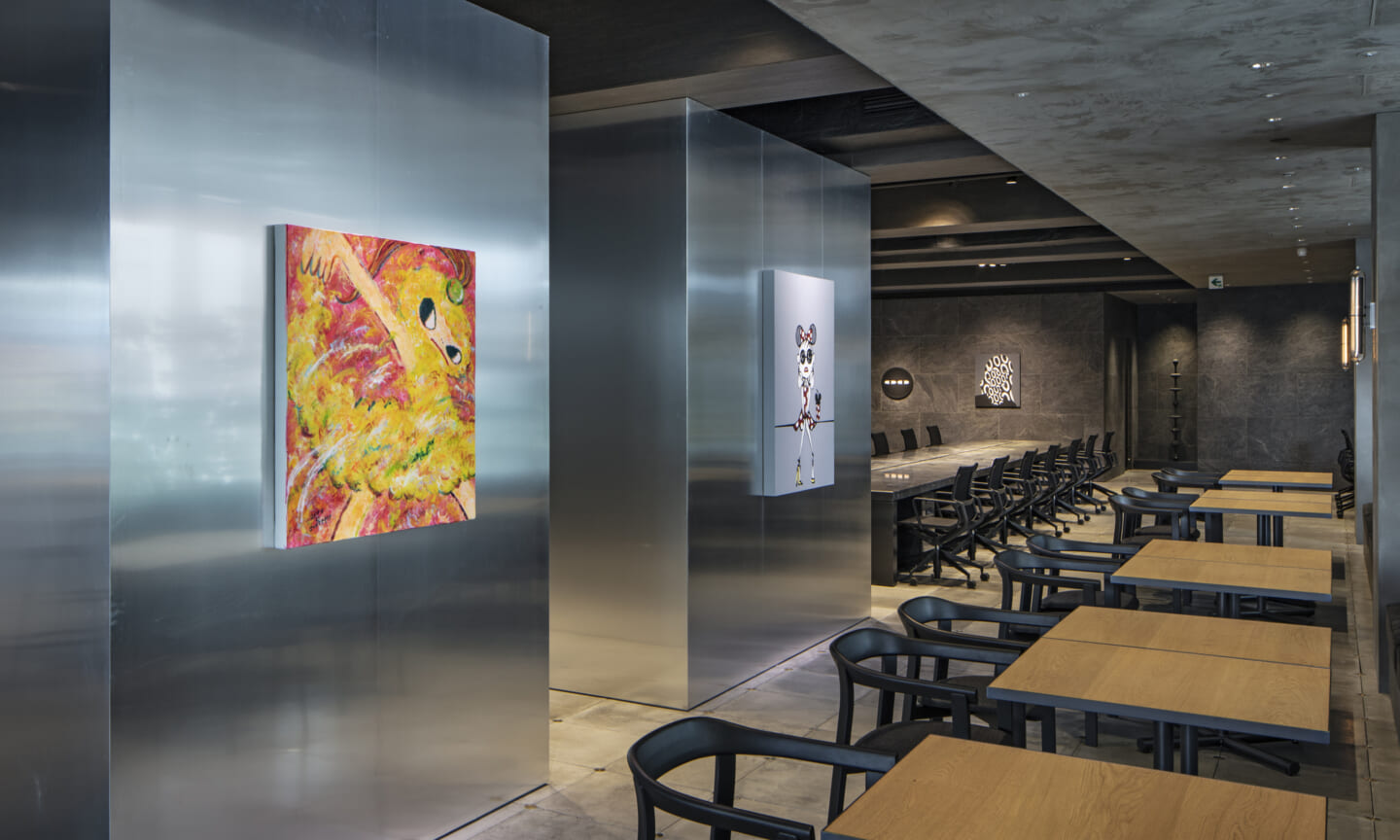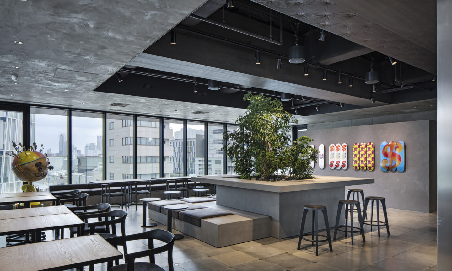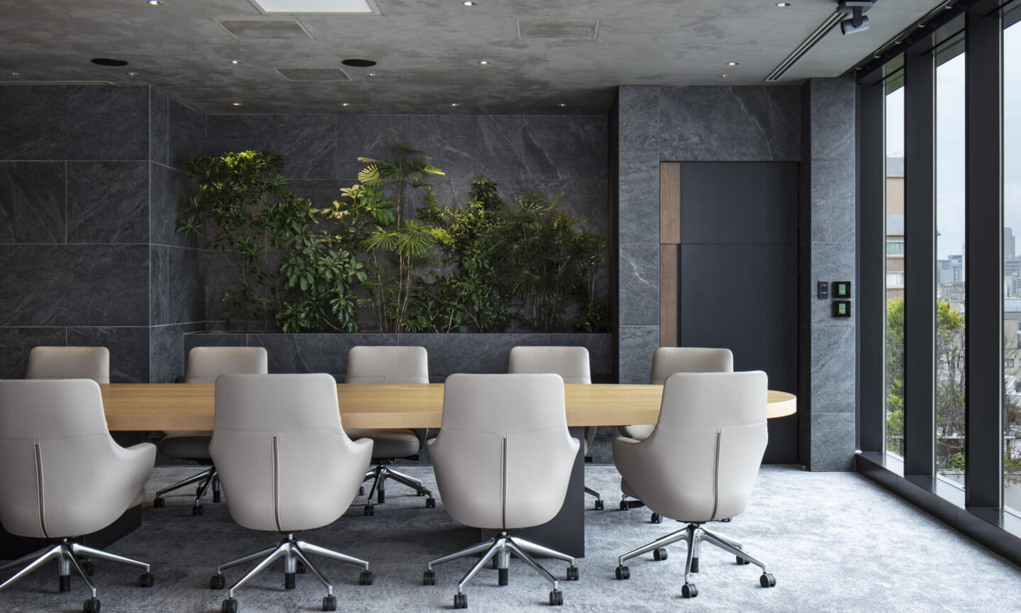 最上階には、カフェエリア、執務空間、役員会議室、社長室を配置している。緑を取り込んだインテリアと点在するボリュームが、外部を歩くようなリズムを生み出しつつ、大空間を役割ごとにやわらかく分節する。空間の性質に応じて配置したアートが、それぞれの場に異なる表情を与えている。