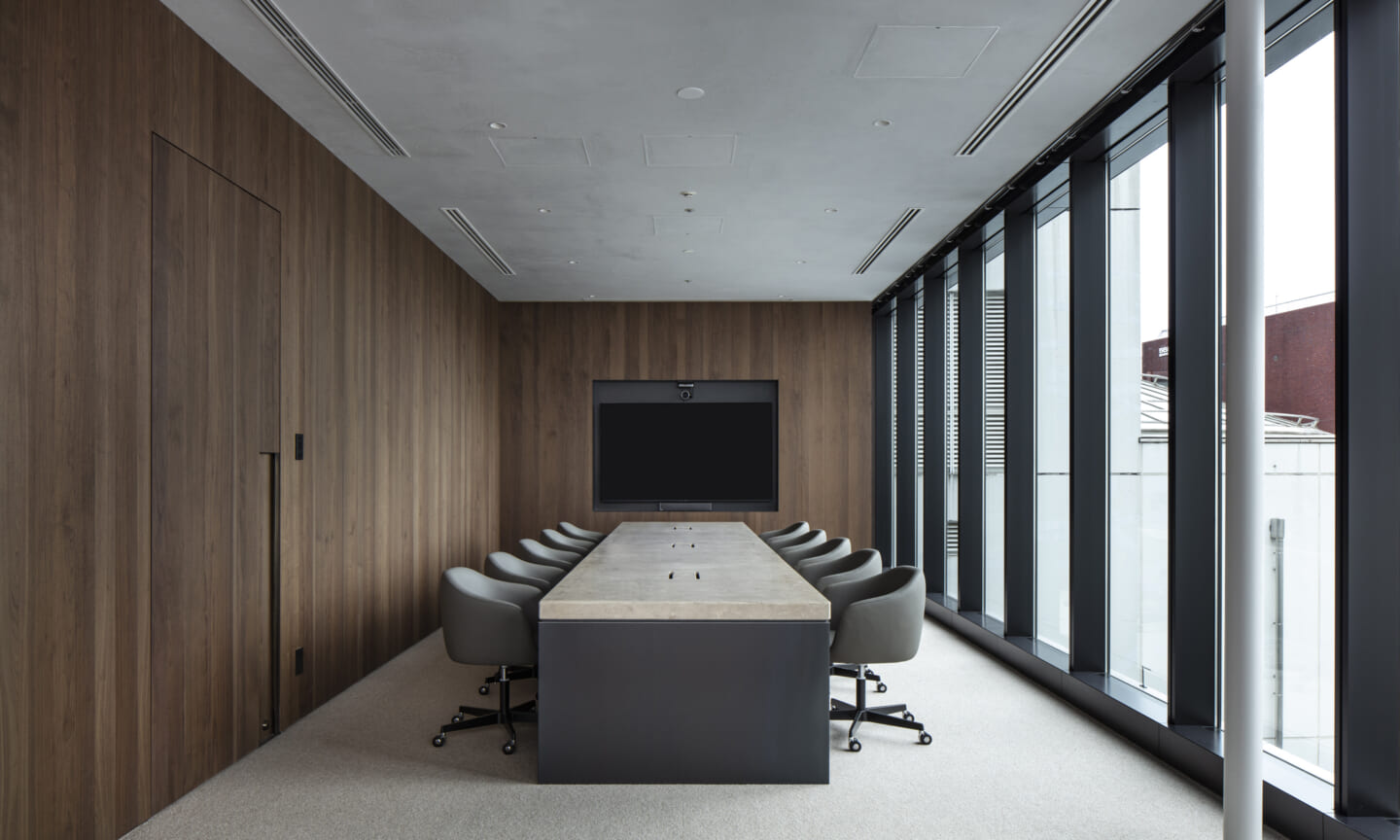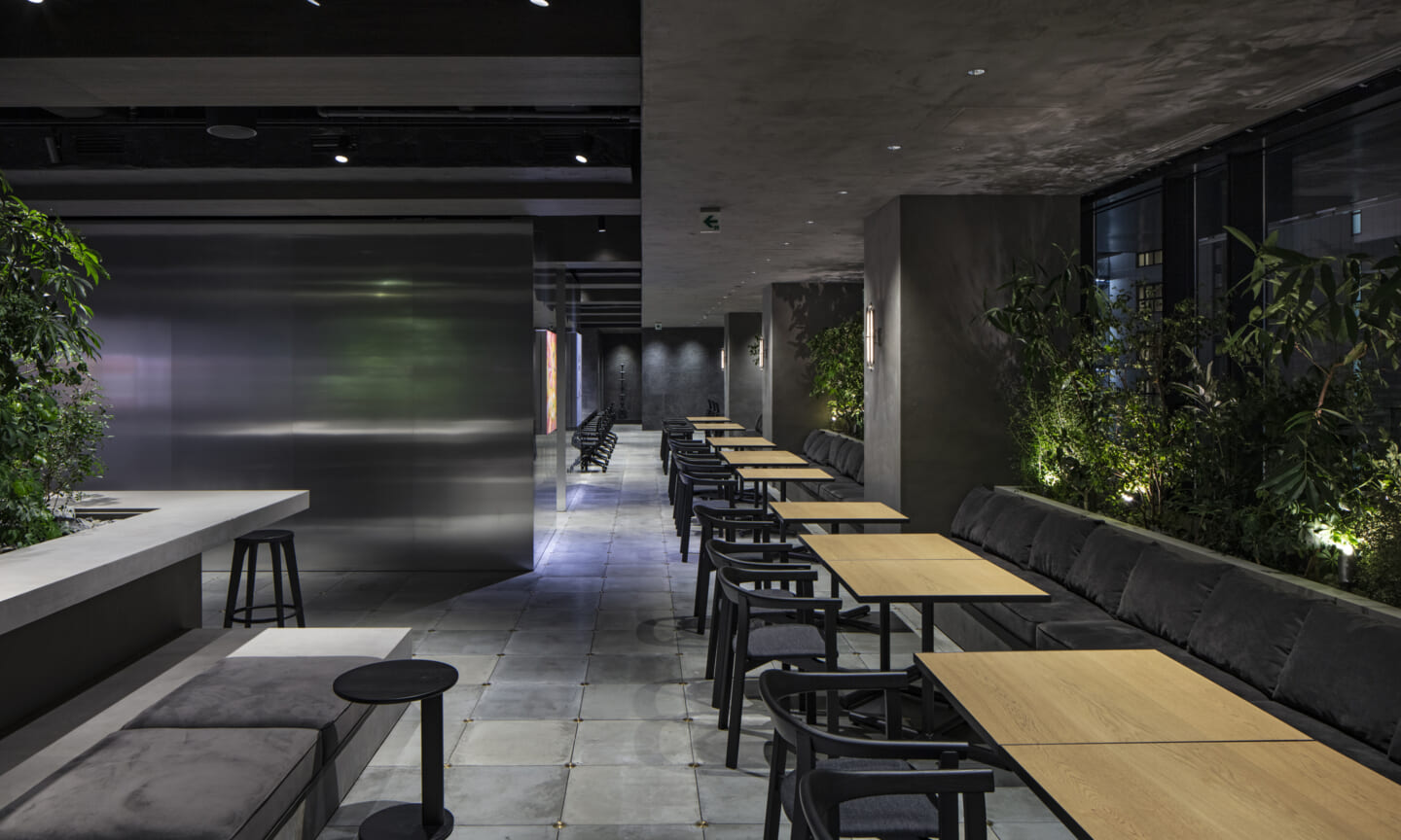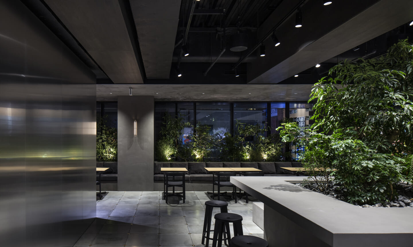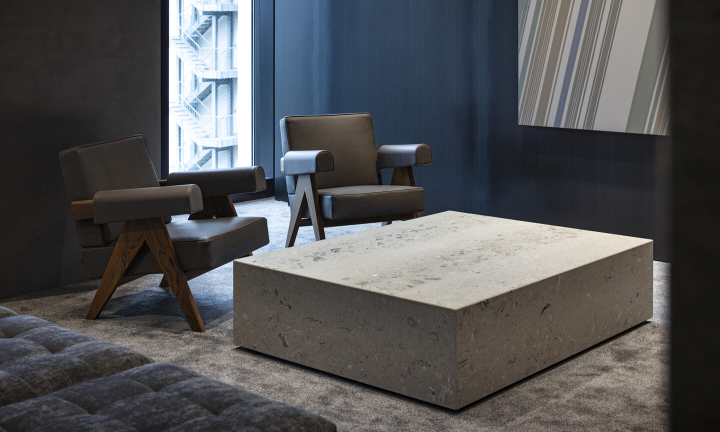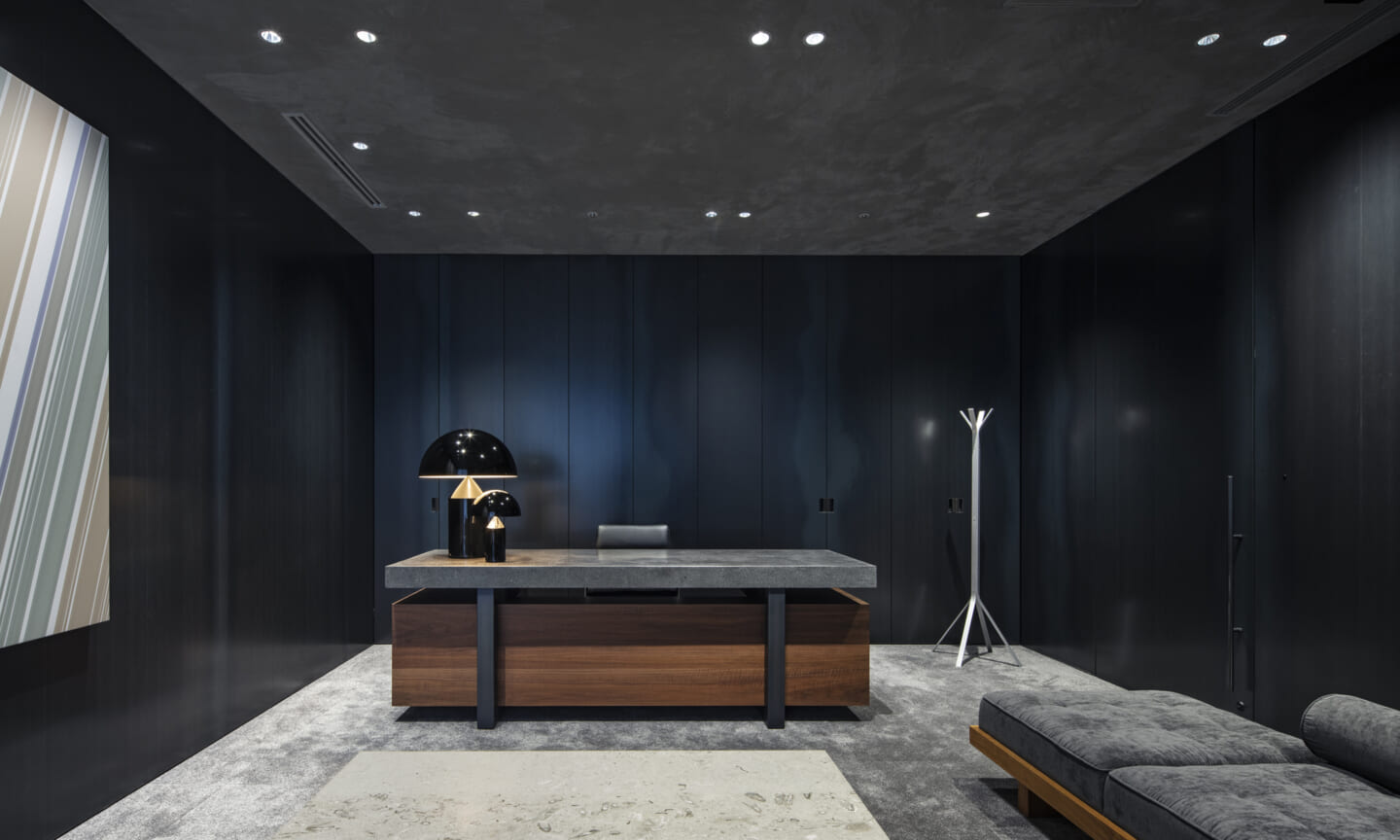最上階には、カフェエリア、執務空間、役員会議室、社長室を配置している。緑を取り込んだインテリアと点在するボリュームが、外部を歩くようなリズムを生み出しつつ、大空間を役割ごとにやわらかく分節する。空間の性質に応じて配置したアートが、それぞれの場に異なる表情を与えている。