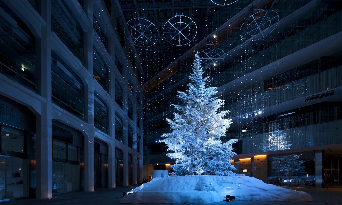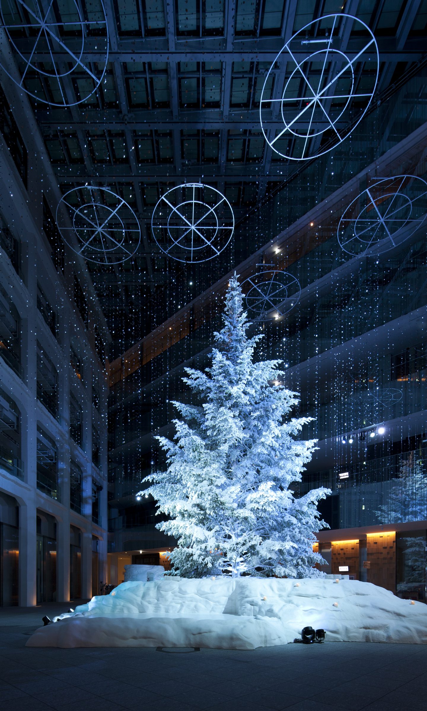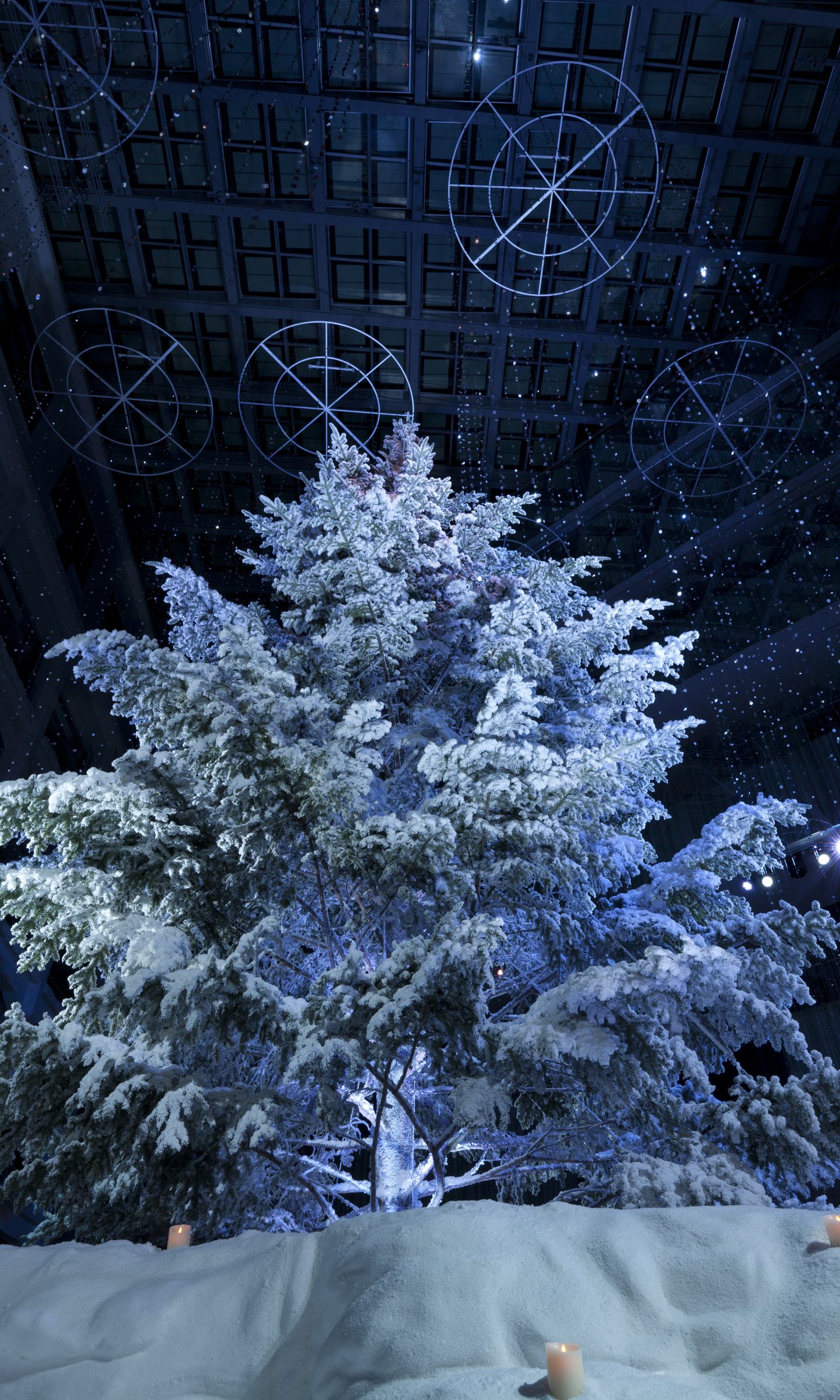 雪国にある大きなもみの木を、ありのままの状態で、KITTEのアトリウム空間に出現させます。