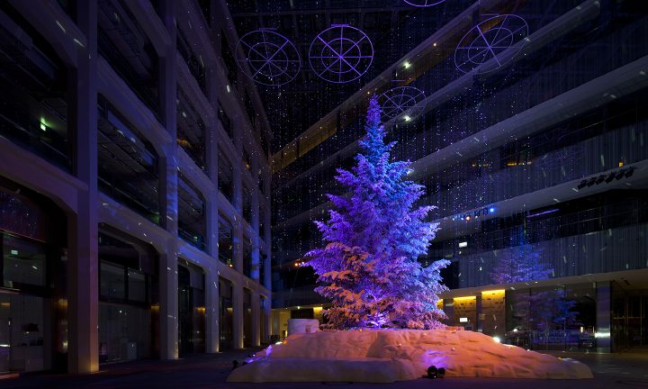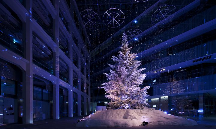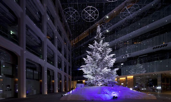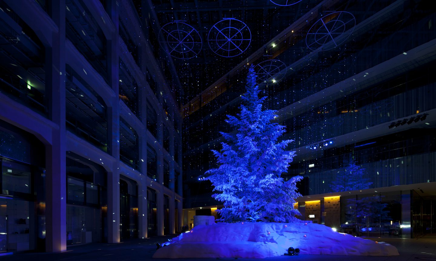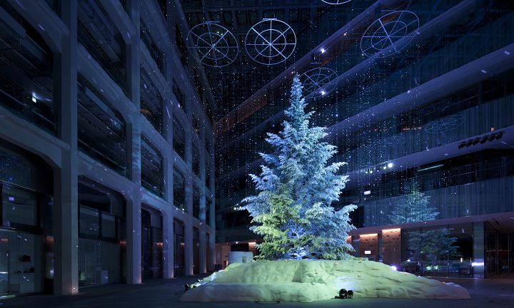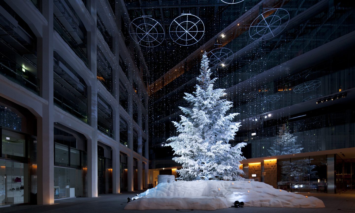 雪国にある大きなもみの木を、ありのままの状態で、KITTEのアトリウム空間に出現させます。